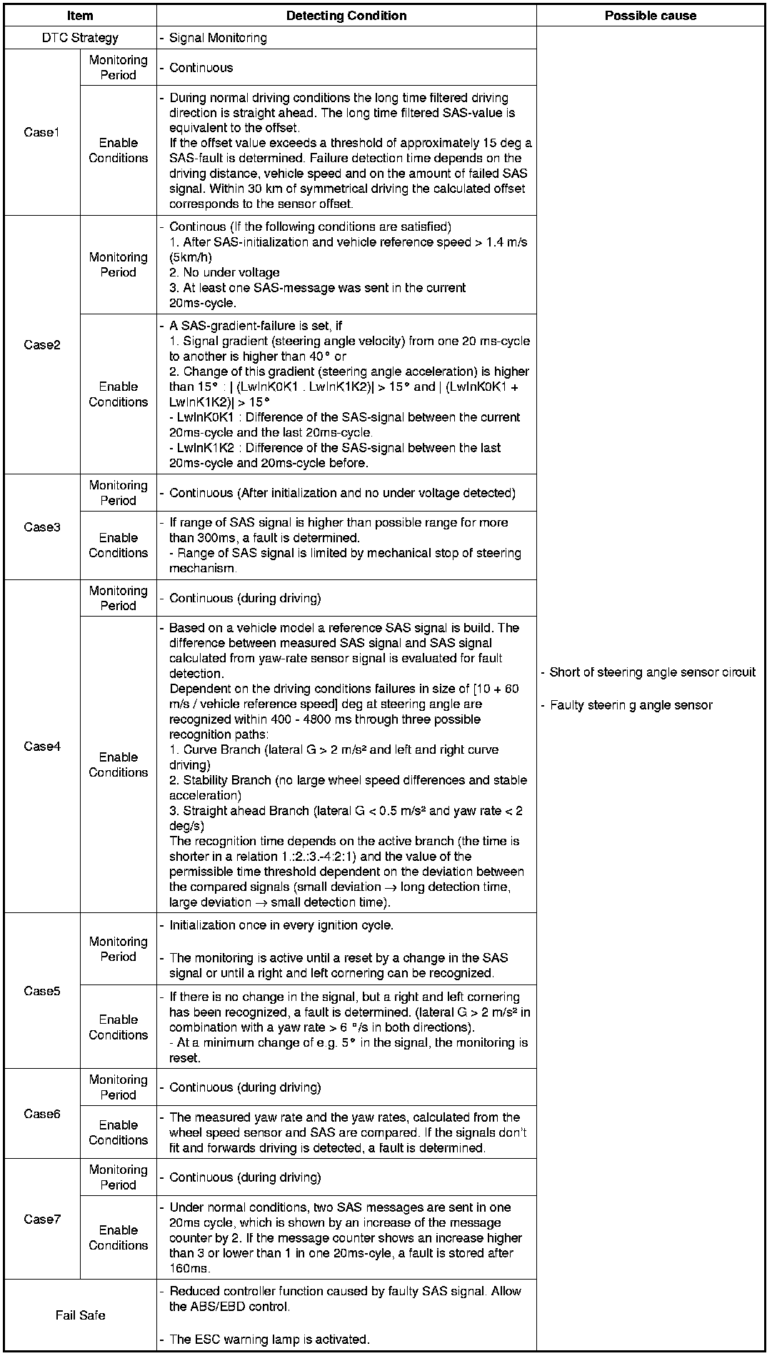 If the SAS signal is different from calculated value by yaw-rate sensor and wheel speed sensor, mechanically impossible SAS signal is detected, there is a difference between SAS signal and driving condition of the vehicle calculated from yaw-rate sensor and lateral G sensor, a failure is detected.