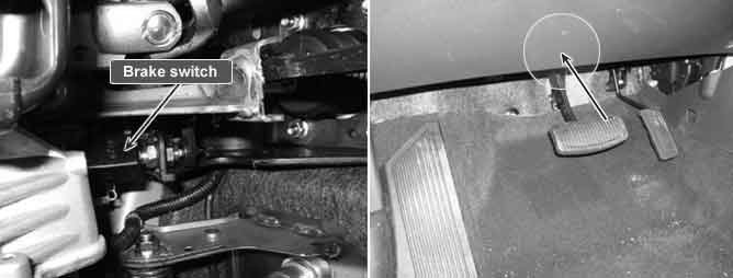 The brake light switch indicates brake pedal status to the ABS control unit. The switch is turned on when brake is depressed. The brake light switch is a normally-open contact which runs to battery voltage when active (brake depressed).