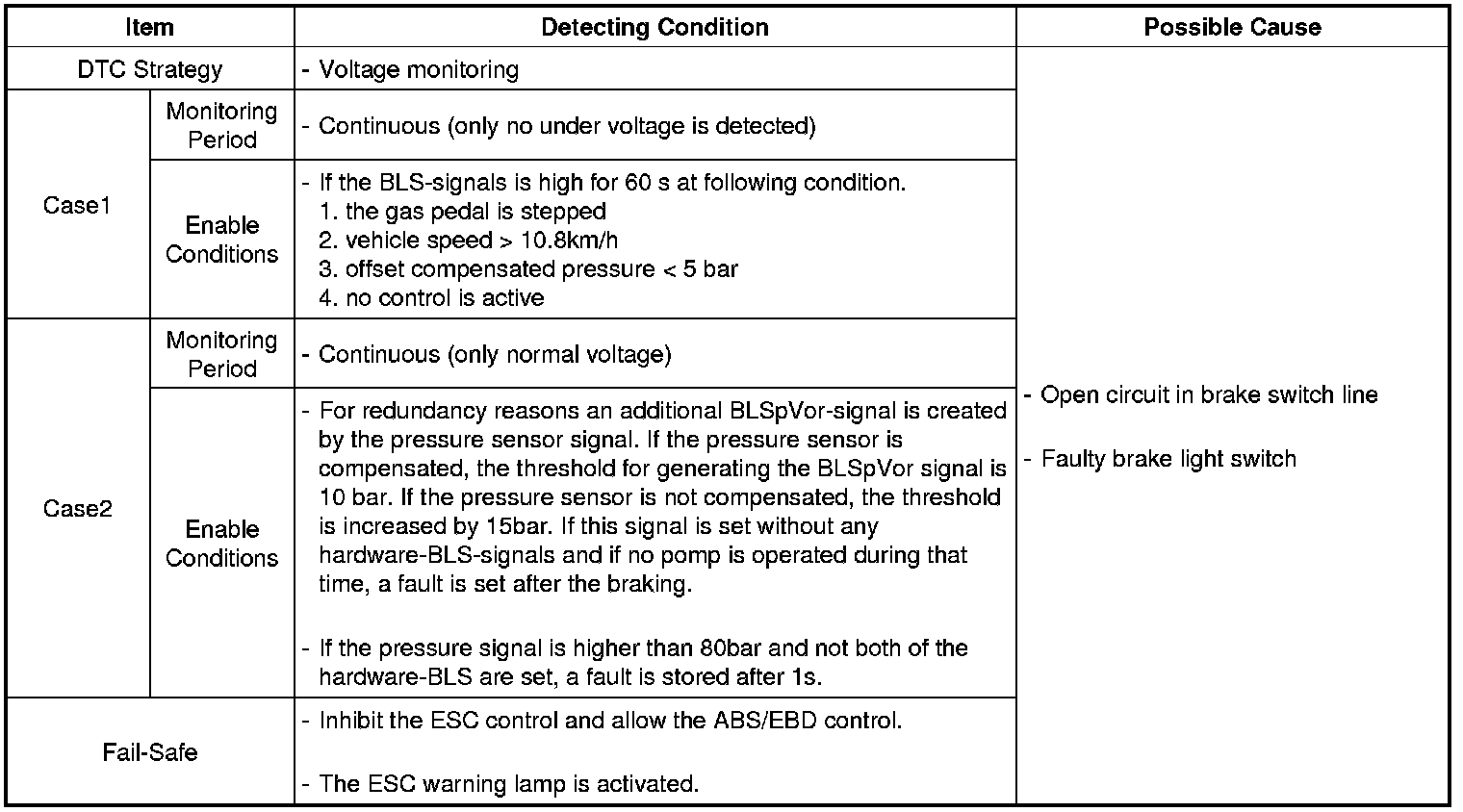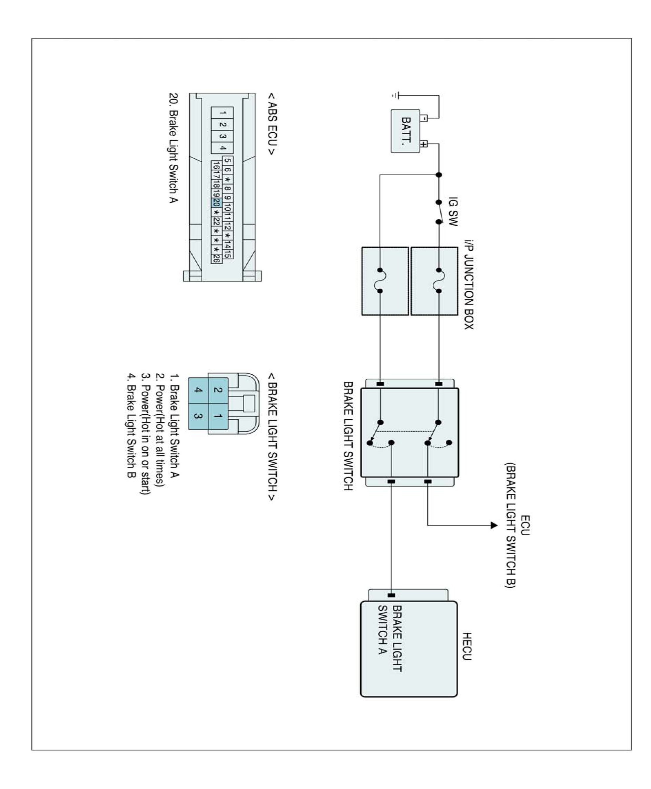 The brake light signal is a reference to judge driver's intention for braking and The HECU checks open or short circuit of brake light switch for normal ABS/ESC control. If an error is present, the warning lamp will illuminate.