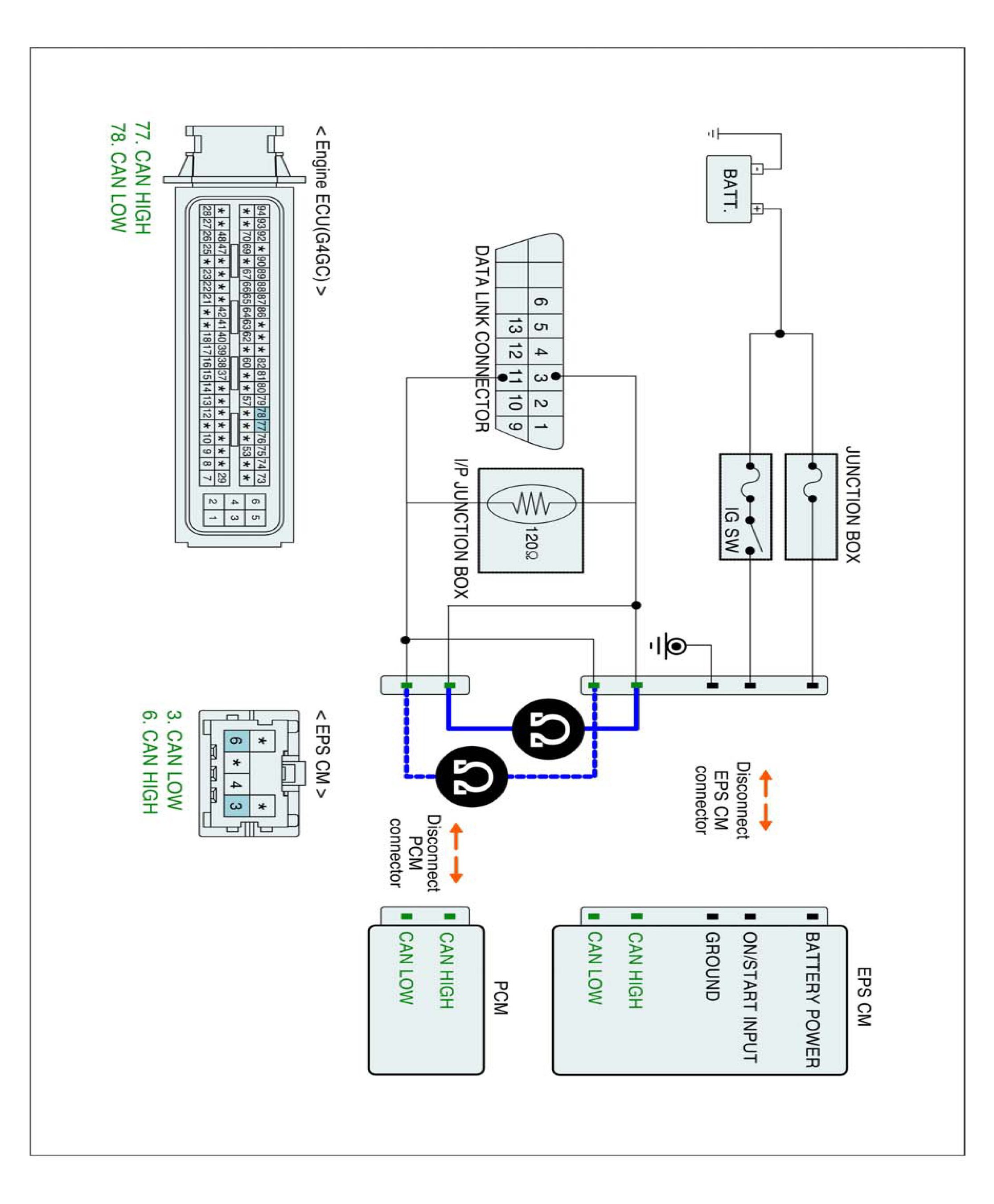 3. Measure resistance between CAN HIGH terminal of the EPS CM harness connector and CAN HIGH terminal terminal of the ECM harness connector.