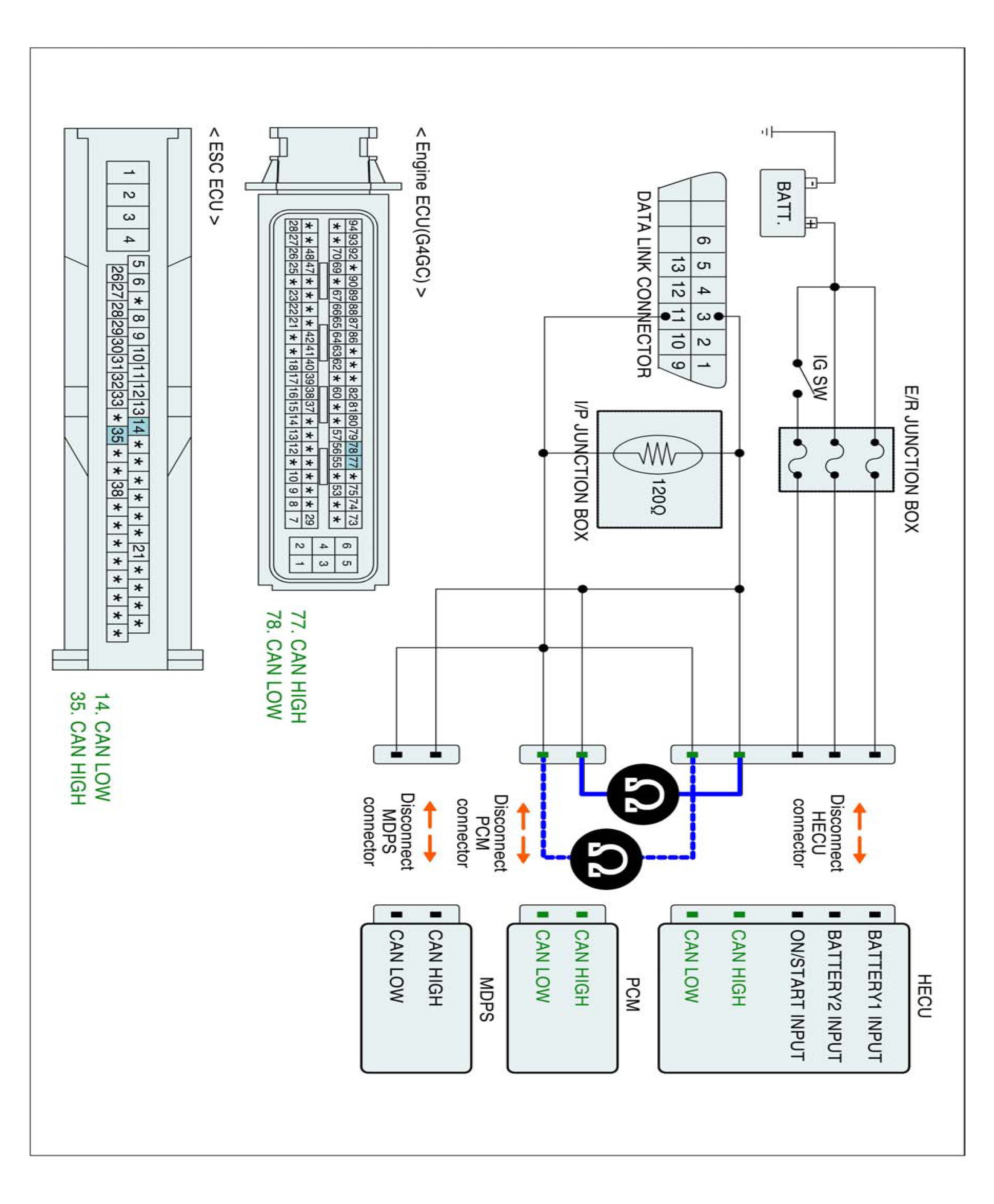 3. Measure resistance between CAN HIGH (LOW) terminal of the HECU harness connector and CAN HIGH (LOW) terminal terminal of the PCM harness connector.