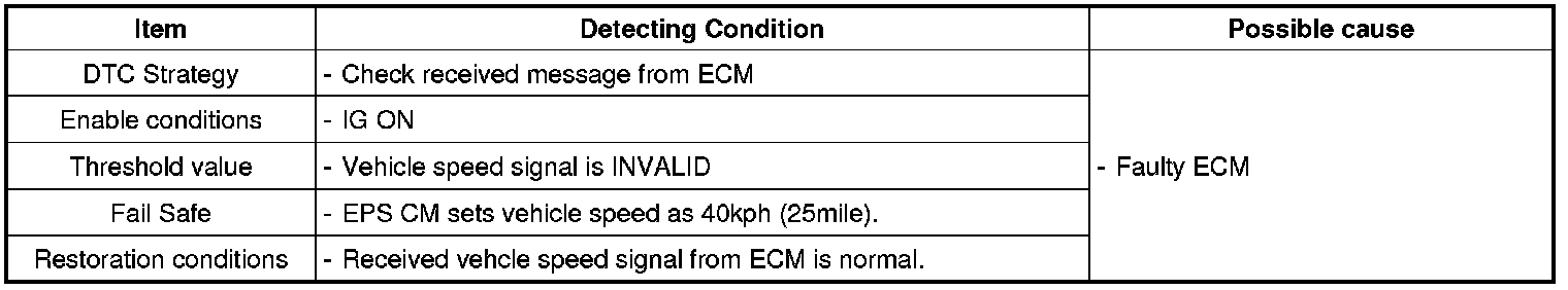 EPS CM sets this code if EPS CM doesn't receives a vehicle speed signal from EMS normally. At that time it controls EPS system by using predefined vehicle speed value.