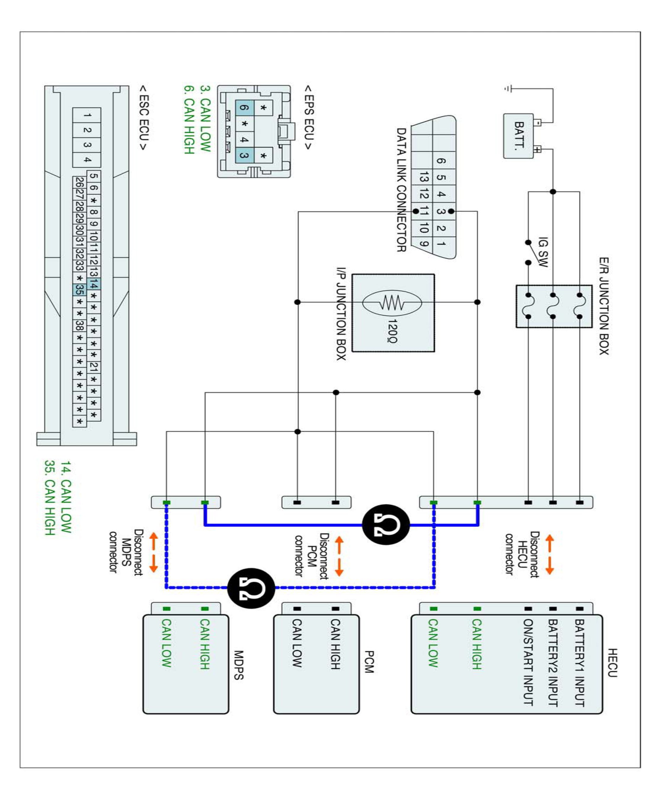 3. Measure resistance between CAN HIGH (LOW) terminal of the HECU harness connector and CAN HIGH (LOW) terminal terminal of the MDPS harness connector.