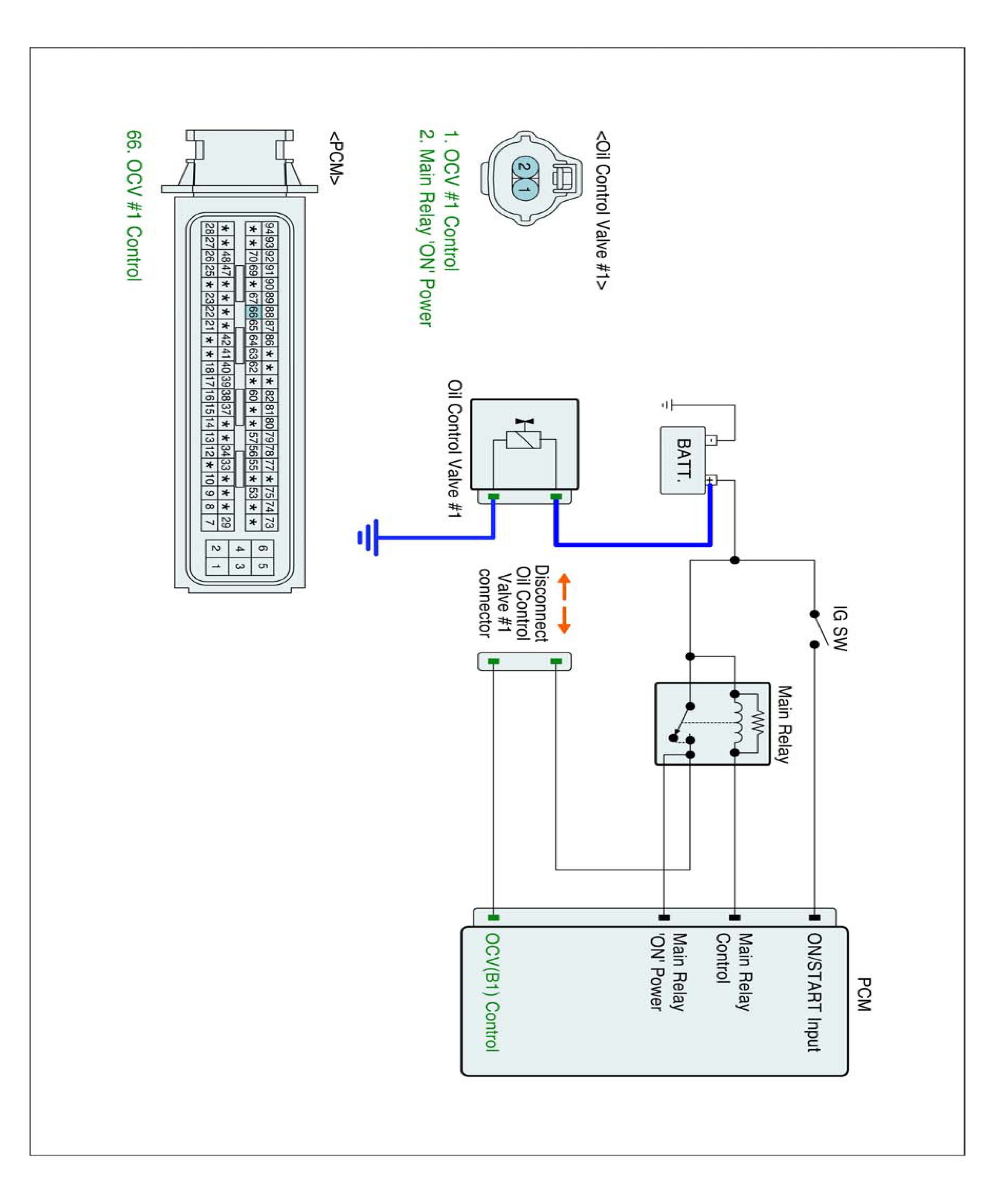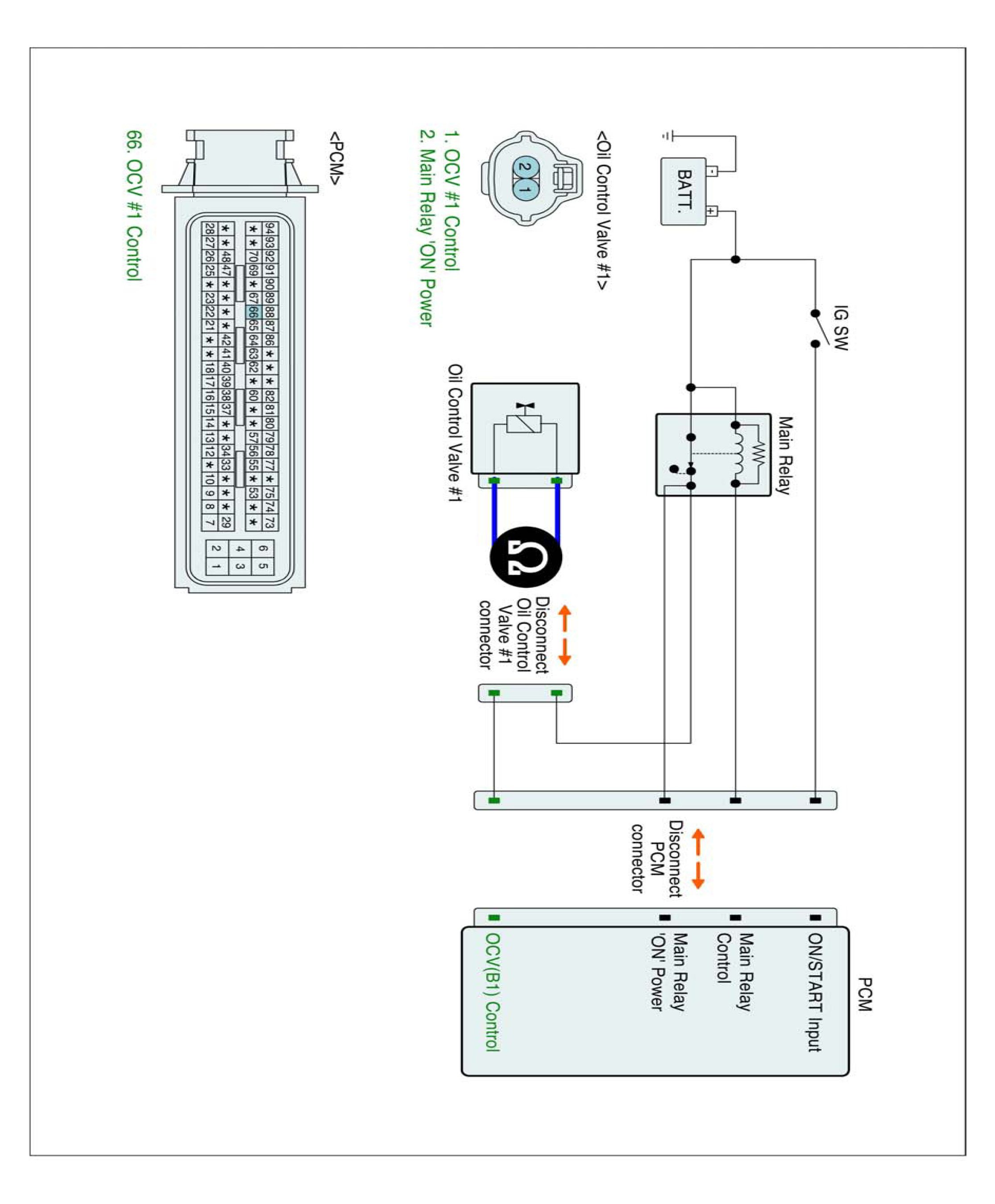 (2) With OCV connector still disconnected, connect 12 V and a ground to 2 and 1 of the OCV (Component side).