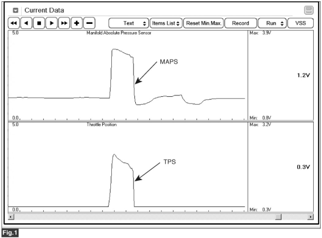 As often as possible, the MAPS signal should be compared with the TPS signal. Check whether the MAPS and TPS signals increase at the same time when accelerating. During acceleration, the MAPS output voltage increases; during deceleration, the MAPS output voltage decreases.