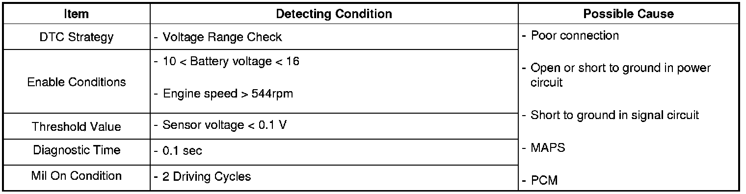 If sensor signal input is lower than 0.25 V during 5 sec, PCM sets DTC P0107.