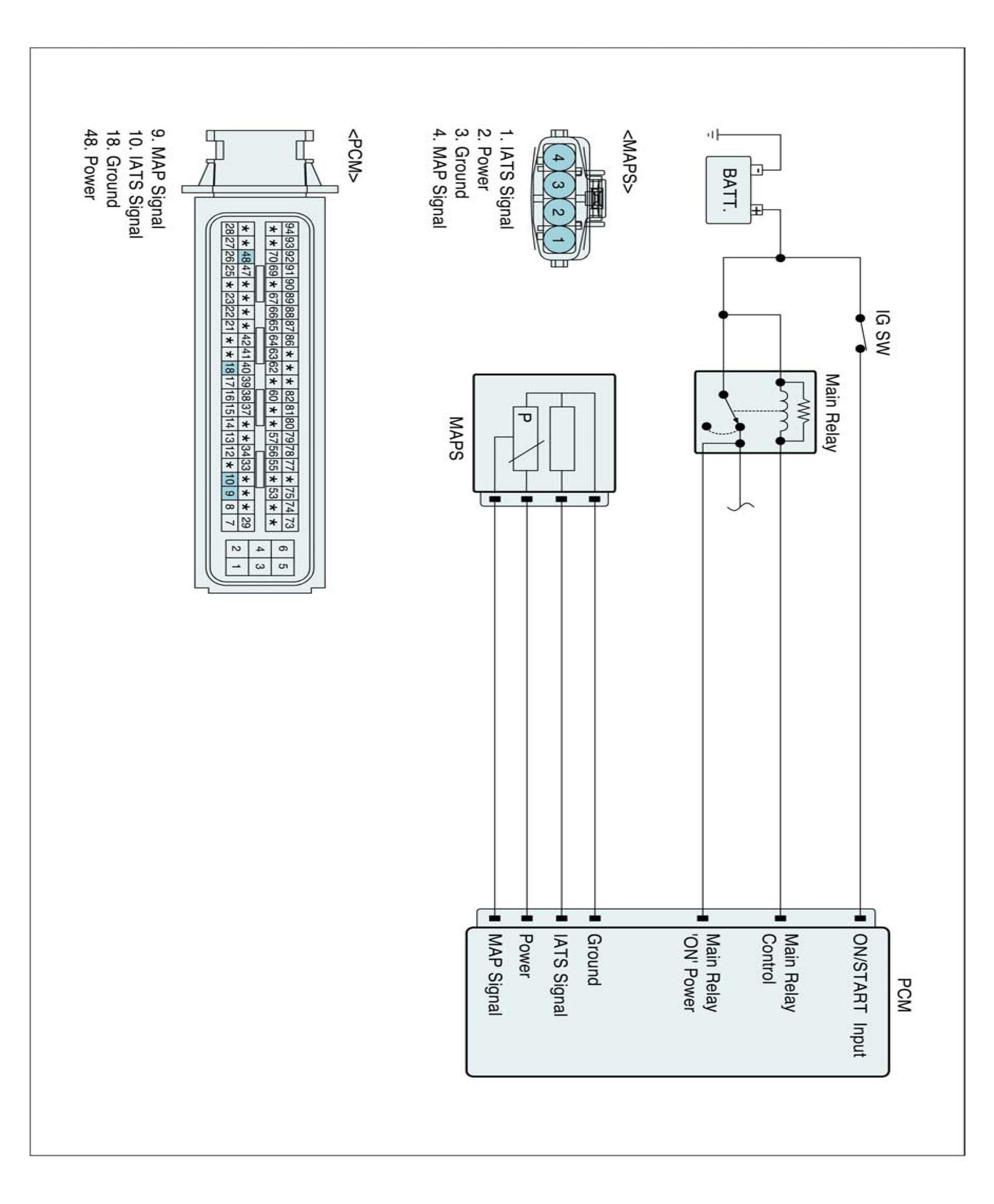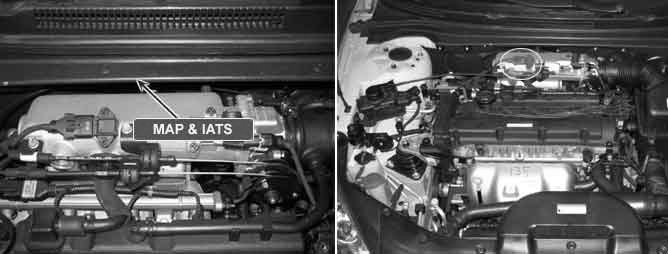 The Intake Air Temperature Sensor (IATS) is installed into the Mass Air Flow Sensor (MAFS). The IATS uses a thermistor whose resistance changes with the temperature. The electrical resistance of the IATS decreases as the temperature increases, and increases as the temperature decreases. The 5 V power source in the PCM is supplied to the IATS via a resistor in the PCM. That is, the resistor in the PCM and the thermistor in the IATS are connected in series. When the resistance value of the thermistor in IATS changes according to the intake air temperature, the signal voltage also changes. Using this signal, the information of the intake air temperature, the PCM corrects basic fuel injection duration and ignition timing.