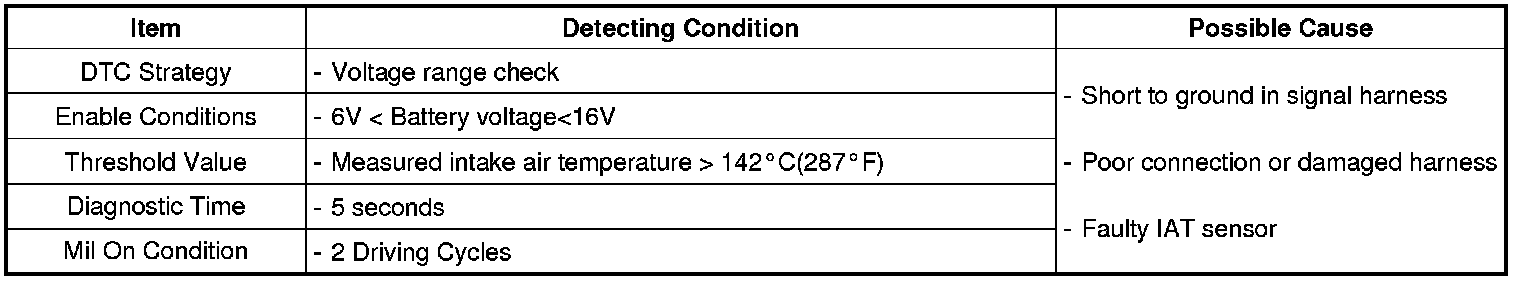 PCM sets DTC P0112 if the PCM detects signal voltage lower than the possible range of a properly operating IATS.