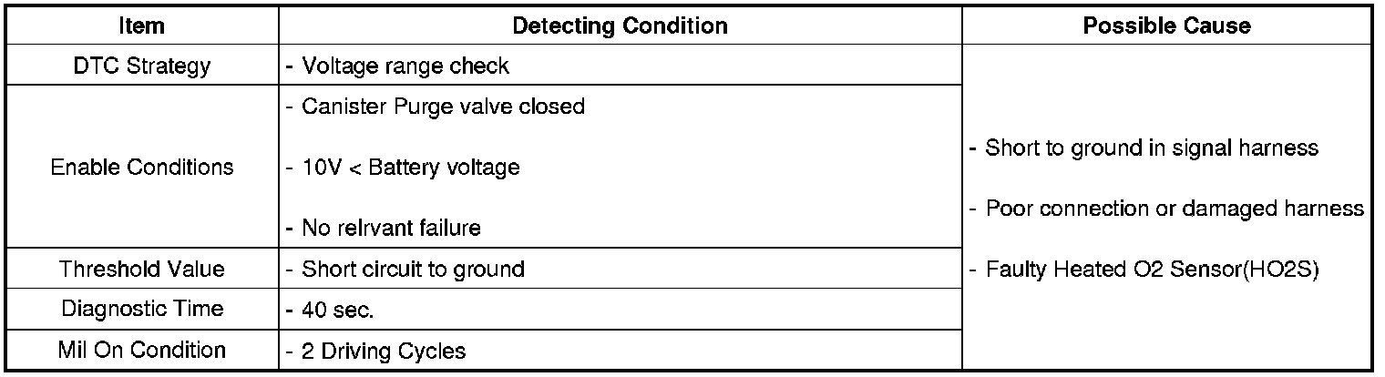 The control unit of the linear oxygen sensor built inside the PCM monitors short circuit error on all front Heated Oxygen Sensor (HO2S) control lines (PIN#19, PIN#40, PIN#41 and PIN#53) and PCM sets P0131 with short circuit to ground.If same code is set again in the next driving cycle, MIL is illuminated.