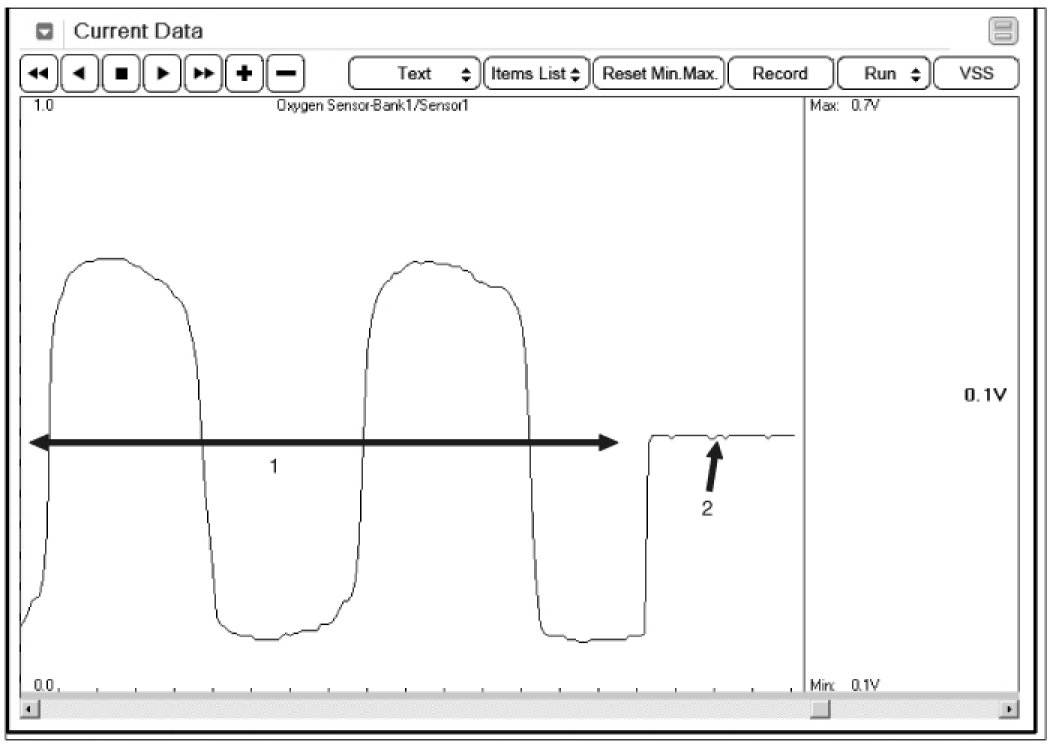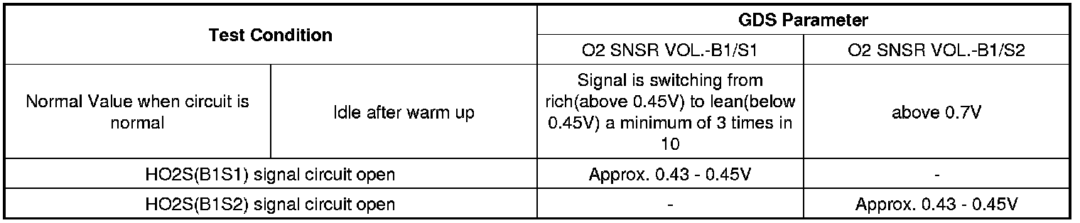 1. Normal value with idle after warm up : Signal is switching from rich (above 0.45 V) to lean (below 0.45 V) a minimum of 3 times in 10 seconds.