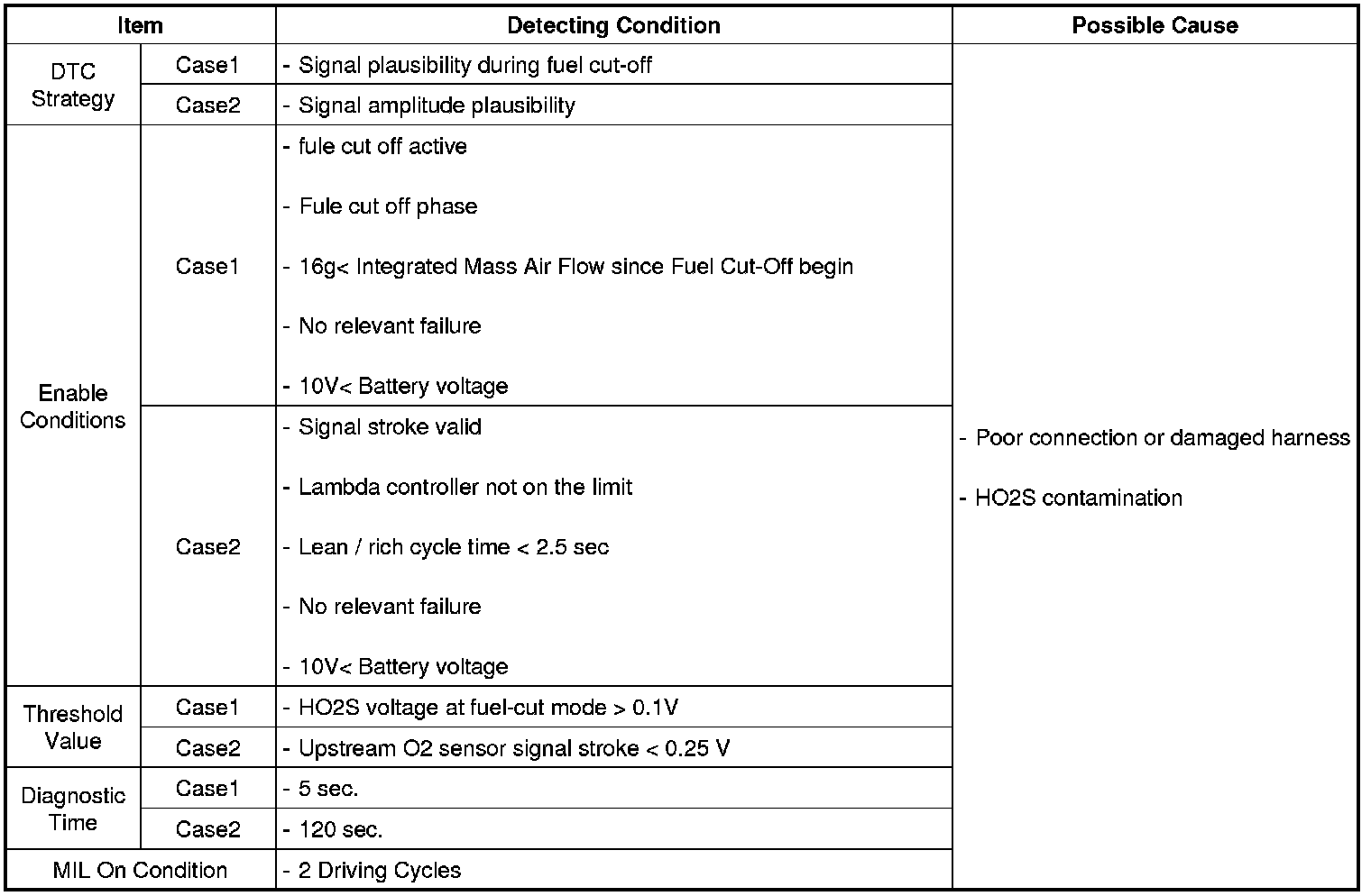 2. Signal plausibility error during fuel cut-off : PCM sets DTC P0134, if the HO2S (B1S1) signal is too high during fuel cut-off period for a predetermined time.