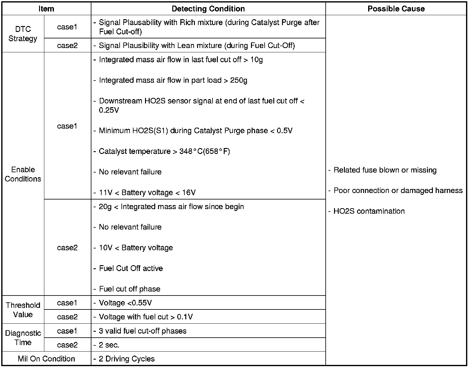 (II) Signal monitoring after fuel cut-off: The PCM monitors rear O2 sensor signal level after leaving fuel cut-off and sets DTC P0140 when signal remains at or below 0.6 V.