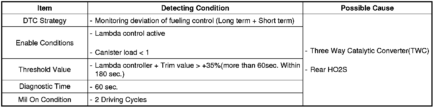 If the lambda controller reaches the maximum or minimum threshold, then feedback control is no longer possible and emissions will be increased. The PCM sets DTC P2096 if no proportional post catalyst fuel trim adaptation occurs for a defined time after the lambda controller has reached its maximum threshold.