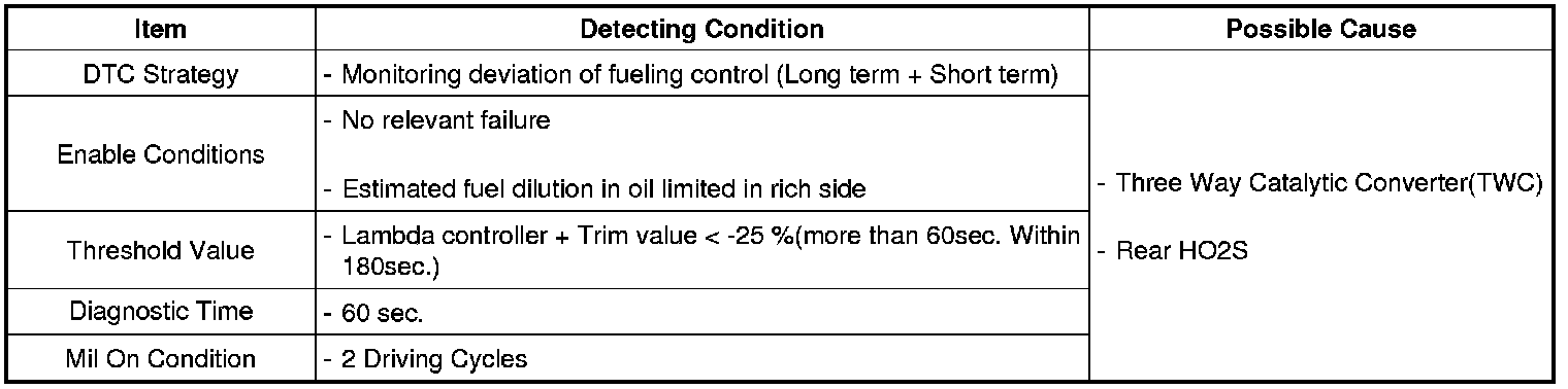 If the lambda controller reaches the maximum or minimum threshold, then feedback control is no longer possible and emissions will be increased. The PCM sets DTC P2097 if no proportional post catalyst fuel trim adaptation occurs for a defined time after the lambda controller has reached its minimum threshold.