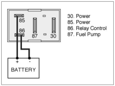 3. Apply 12 V and a ground to 85 and 86 terminals of the fuel pump relay (Components side).