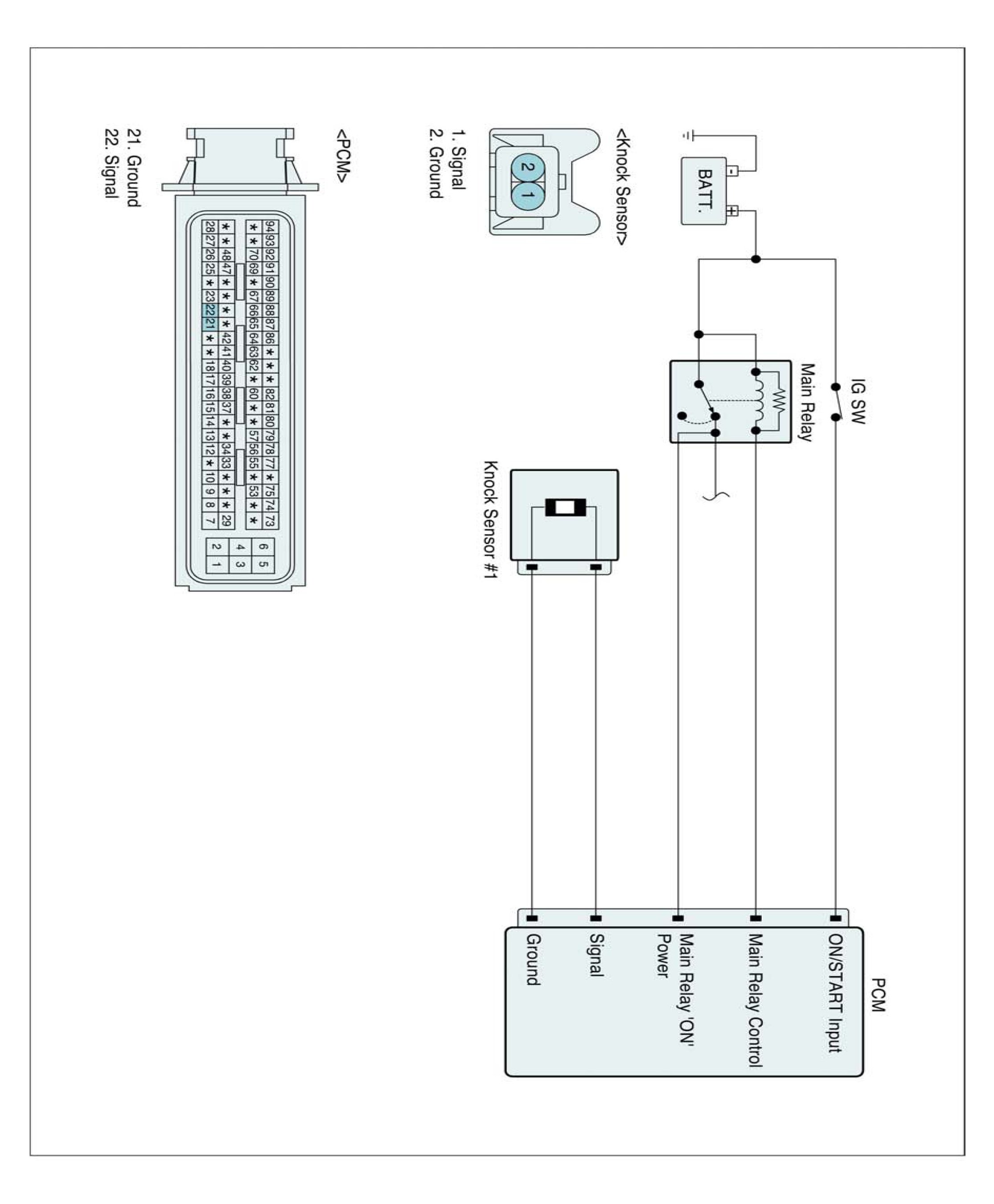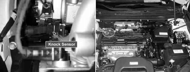 The knock sensor is attached to the cylinder block and senses engine knocking. The sensor contains a piezoelectric element that converts vibration (or noise) into voltage signal and sends this signal to PCM. With input signals from camshaft position and crankshaft position sensor, PCM can identify which cylinder is knocking. PCM filters vibrations and determines if the vibrations are knocking signal. The Engine Control Module (PCM) uses this signal to suppress knocking by retarding ignition timing. The PCM will set a code (Malfunction Indicator Lamp will Not turn on) if during two driving cycles the Knock sensor's output voltage falls below minimum threshold. This code indicates an unexpected vibration is being read by the Knock sensor or PCM under normal engine operation.