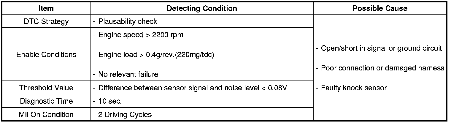 The PCM monitors the range of the analog input signal from knock sensor to check sensor failure that is short circuit or open circuit. If the difference between knock signal and noise level is smaller than the threshold during defined time period, the DTC P0325 is set. In case the noise level is higher than the upper threshold or lower than the lower threshold, the DTC P0325 is set too.