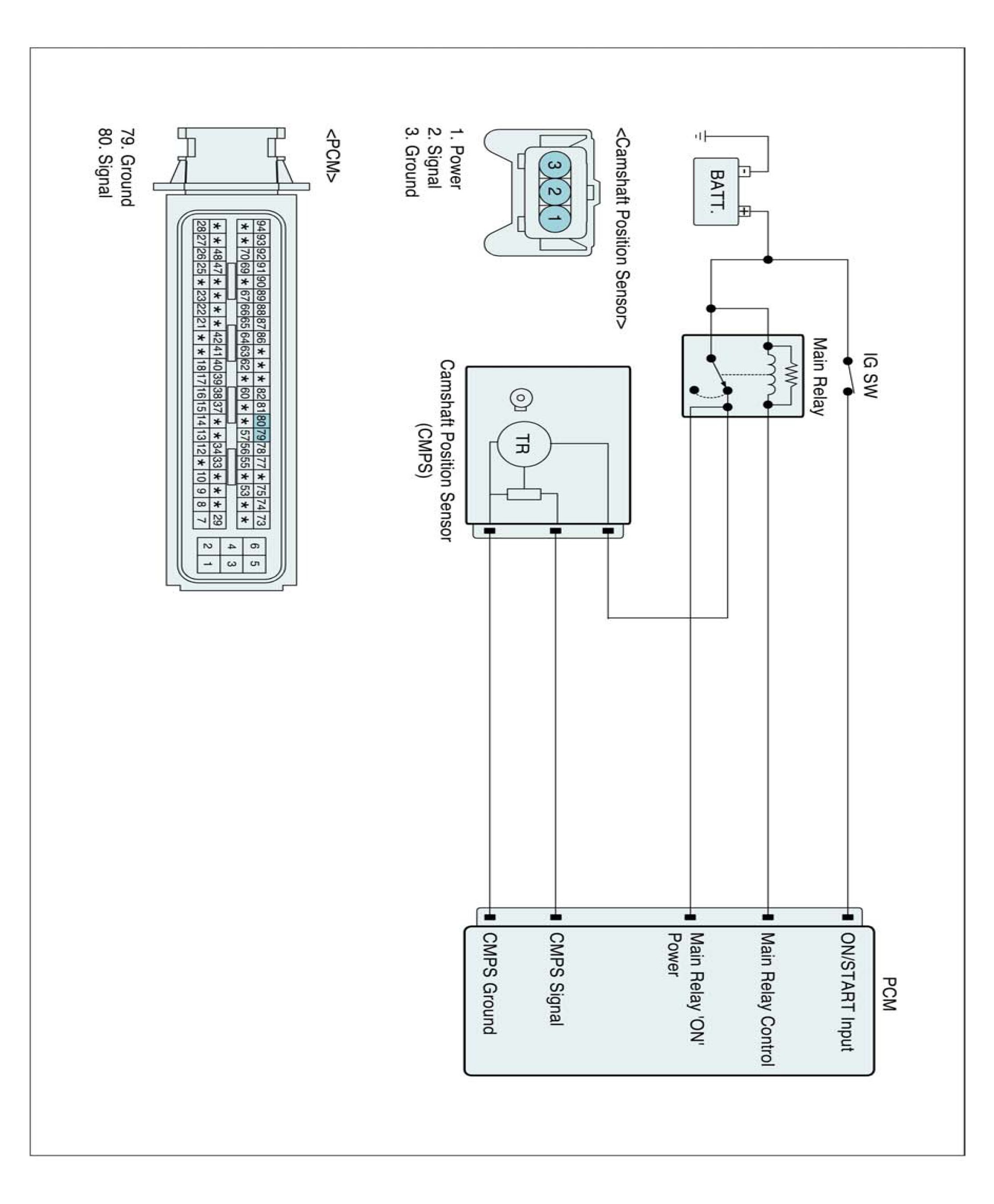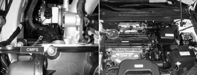 The Camshaft Position Sensor (CMPS) is a sensor that detects the compression TDC of the NO. 1 cylinder. The CMPS consists of a hall type sensor and a target on the end of the intake camshaft. When the target triggers the sensor, the sensor voltage is 5 V. If not, the sensor voltage is 0 V. These CMPS signal is sent to the PCM and the PCM uses the CMPS signal for synchronizing the firing of sequential fuel injectors.