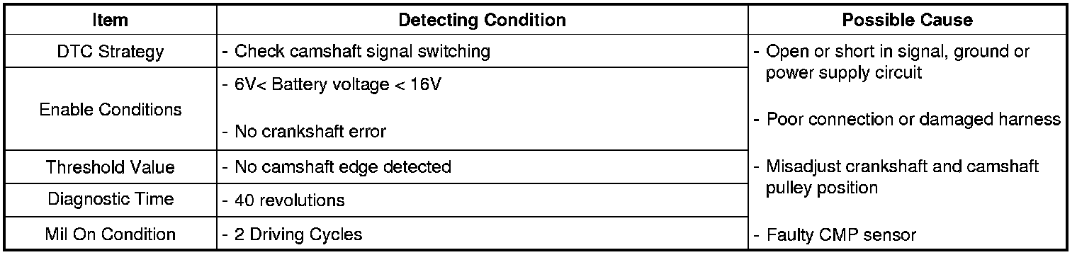 The PCM monitors the camshaft sensor signal transition position which must change only once per crankshaft revolution. If no camshaft signal is detected while crankshaft signal is detected, the PCM sets DTC P0340.