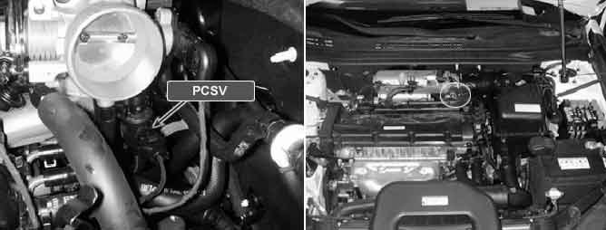 The evaporative emission control system prevents hydrocarbon (HC) vapors from the fuel tank from escaping into the atmosphere where they could form photochemical smog. Gasoline vapors are collected in the charcoal canister. The PCM controls the Purge Control Solenoid Valve (PCSV) to purge any collected vapors from the canister back to the engine for combustion. This valve is actuated by the purge control signal from the PCM and controls fuel vapor from the canister to the intake manifold.