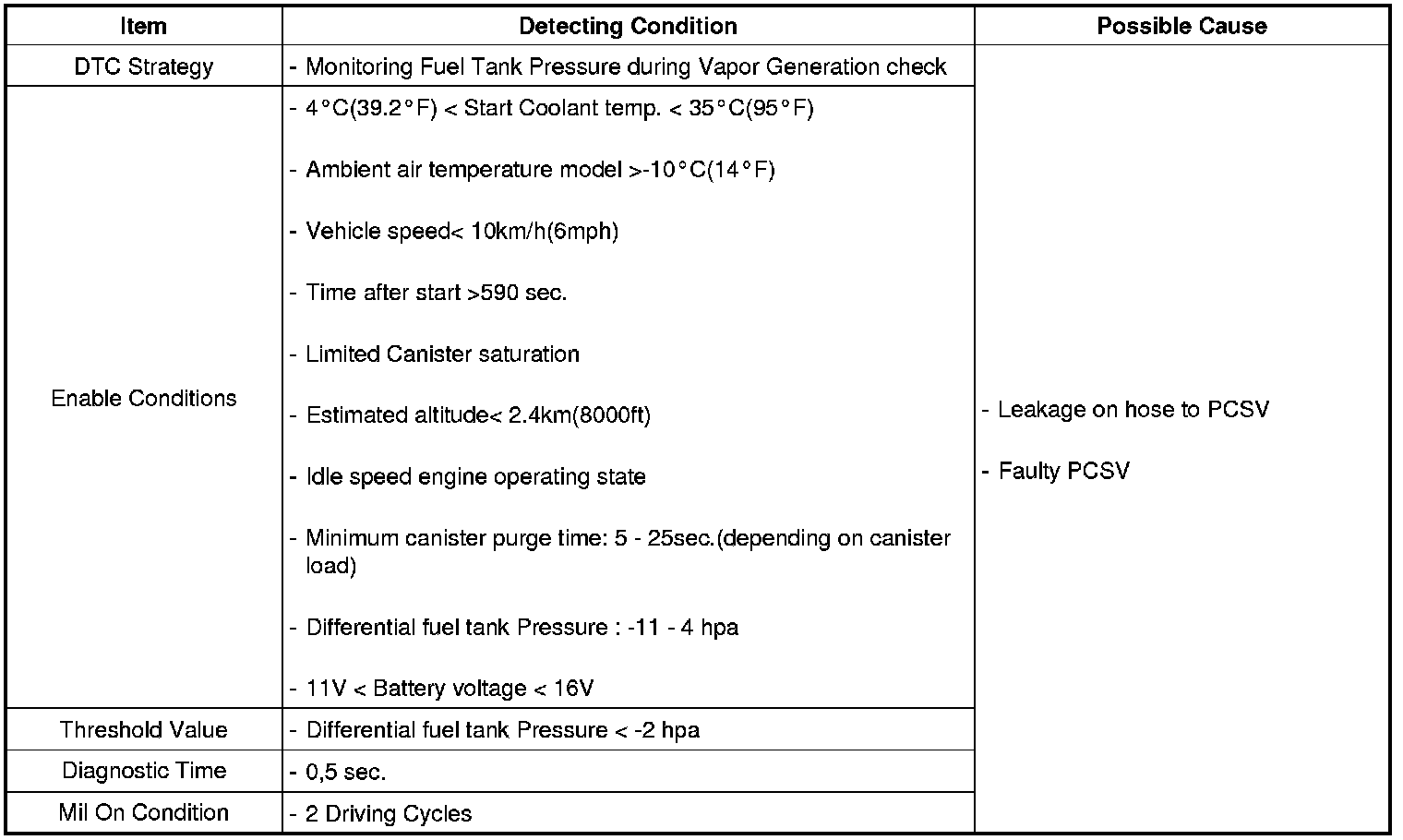 During "test of vapor generation" a new value from the tank pressure sensor is measured and compared with the start pressure at beginning of "test of vapor generation".The PCM sets DTC P0441 if the pressure signal decrease occurs and the difference is below the predetermined threshold.