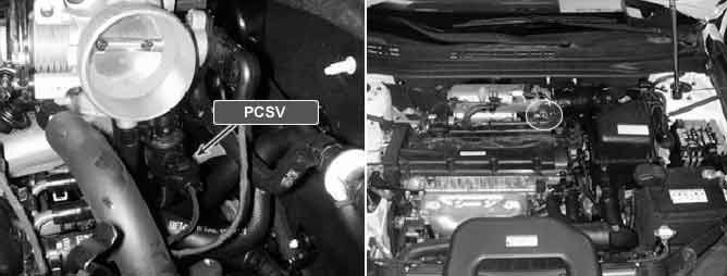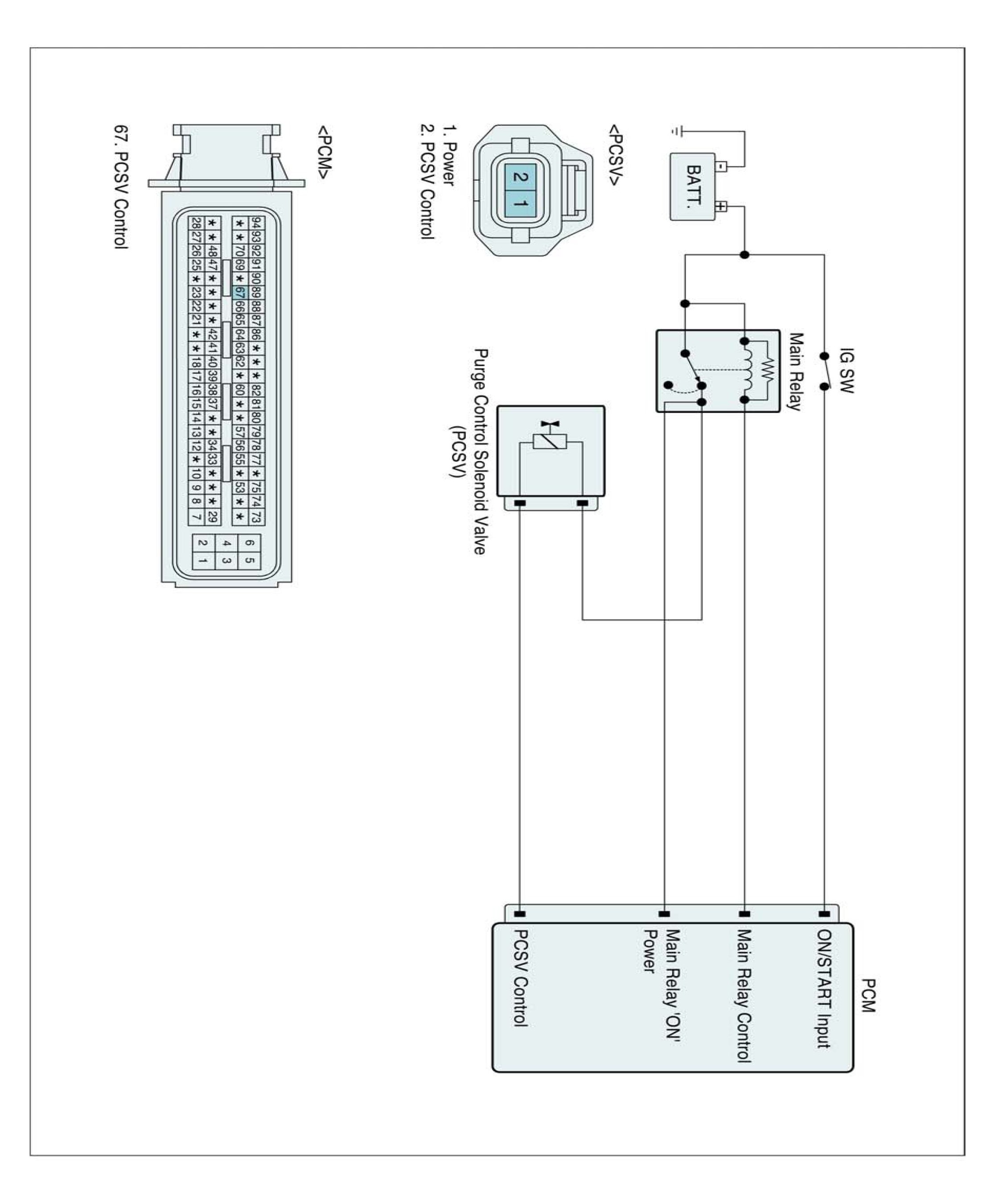 The evaporative emission control system prevents hydrocarbon (HC) vapors from the fuel tank from escaping into the atmosphere where they could form photochemical smog. Gasoline vapors are collected in the charcoal canister. The PCM controls the Purge Control Solenoid Valve (PCSV) to purge any collected vapors from the canister back to the engine for combustion. This valve is actuated by the purge control signal from the PCM and controls fuel vapor flow from the canister to the intake manifold.