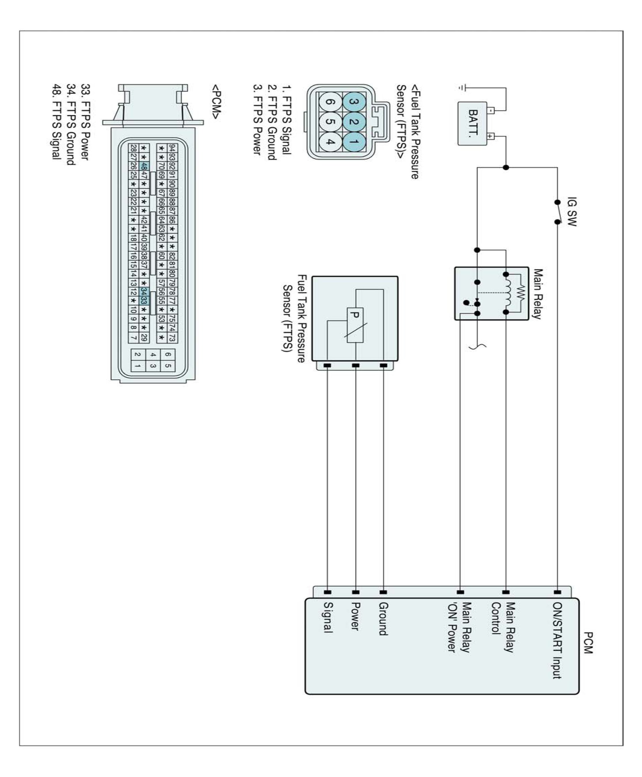 The evaporative emission control system prevents hydrocarbon vapors from escaping from the fuel tank into the atmosphere where they could form photochemical smog. Gasoline vapors are collected in the charcoal canister. The Fuel Tank Pressure Sensor (FTPS) is an integral part of the evaporative monitoring system. The PCM monitors the FTPS signal to detect vacuum decay and excess vacuum. The FTPS measures the difference between the air pressure inside the fuel tank and outside air pressure to check the purge control solenoid valve operation and for leak detection in the evaporative emission control system by monitoring pressure and vacuum levels in the fuel tank during the purge control solenoid valve operating cycles.