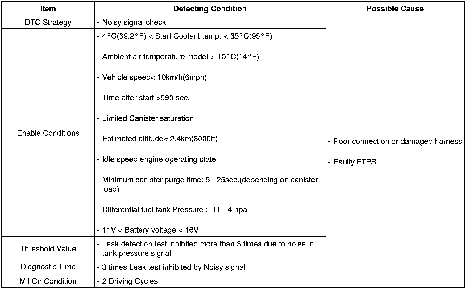 The PCM monitors pressure stability in the fuel tank by means of Fuel Tank Pressure Sensor (FTPS) for predetermined duration just before start the leakage monitoring to detect noise signal of pressure sensor. The PCM sets DTC P0454 if the pressure fluctuation is bigger than predetermined threshold.