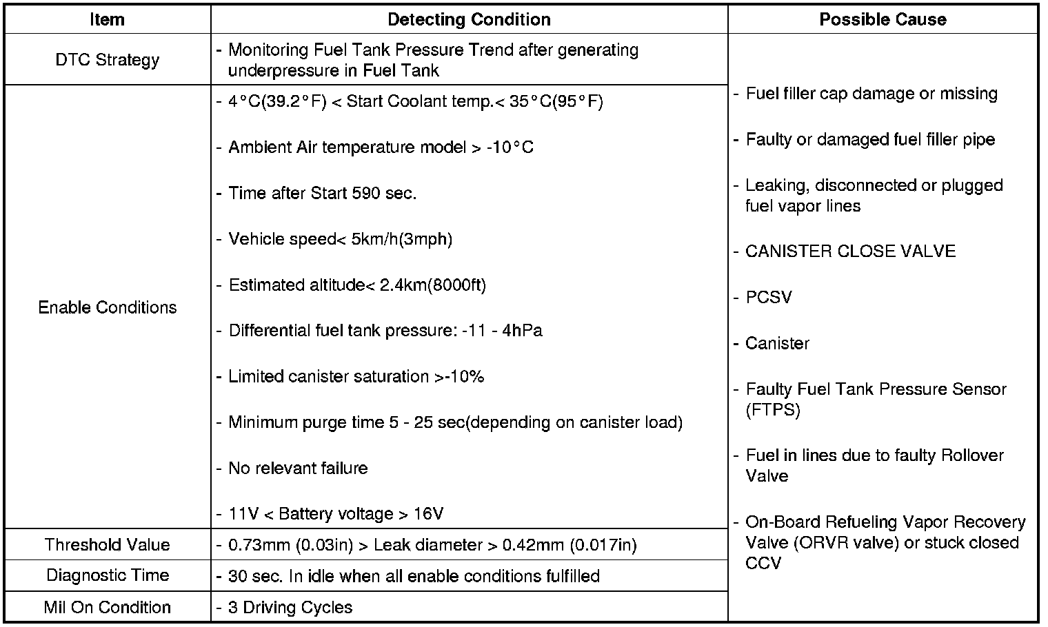 The PCM closes the Canister Close Valve (CCV) at the charcoal canister to seal off the evaporative emission system and then opens purge control valve (PCSV) to generate a vacuum in the fuel tank. After vacuum generation, the PCM measures pressure differential curve in the fuel tank and sets DTC P0442 or P0456 if the vacuum generated within a monitoring period increases above a defined threshold.