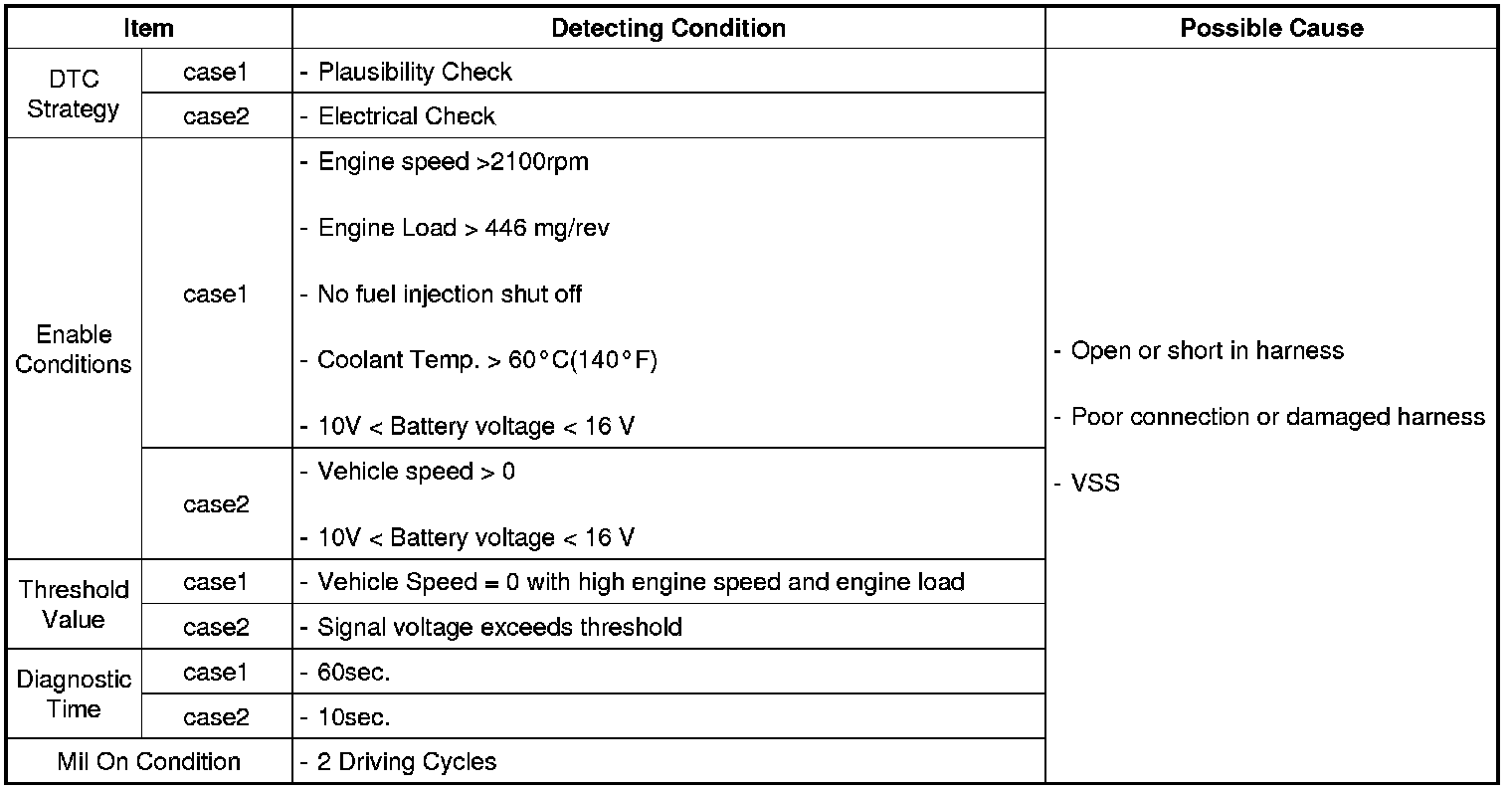 The PCM evaluates engine speed and mass air flow if there is no vehicle speed signal. This evaluation of both values will detect open circuit or short circuit errors on the wheel speed sensor. The PCM sets DTC P2159 if there is no vehicle speed signal from wheel speed sensor while both engine speed and mass air flow are higher than predetermined threshold during the predetermined time