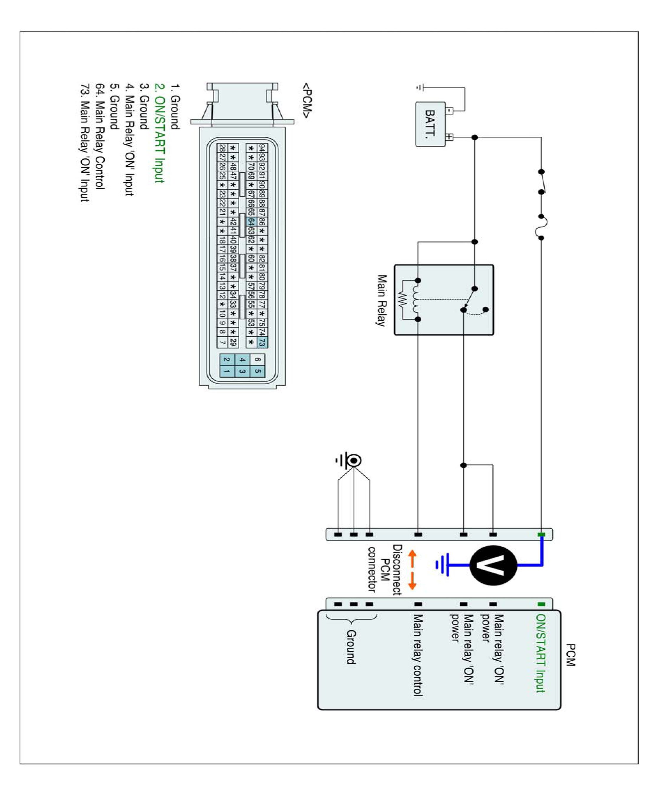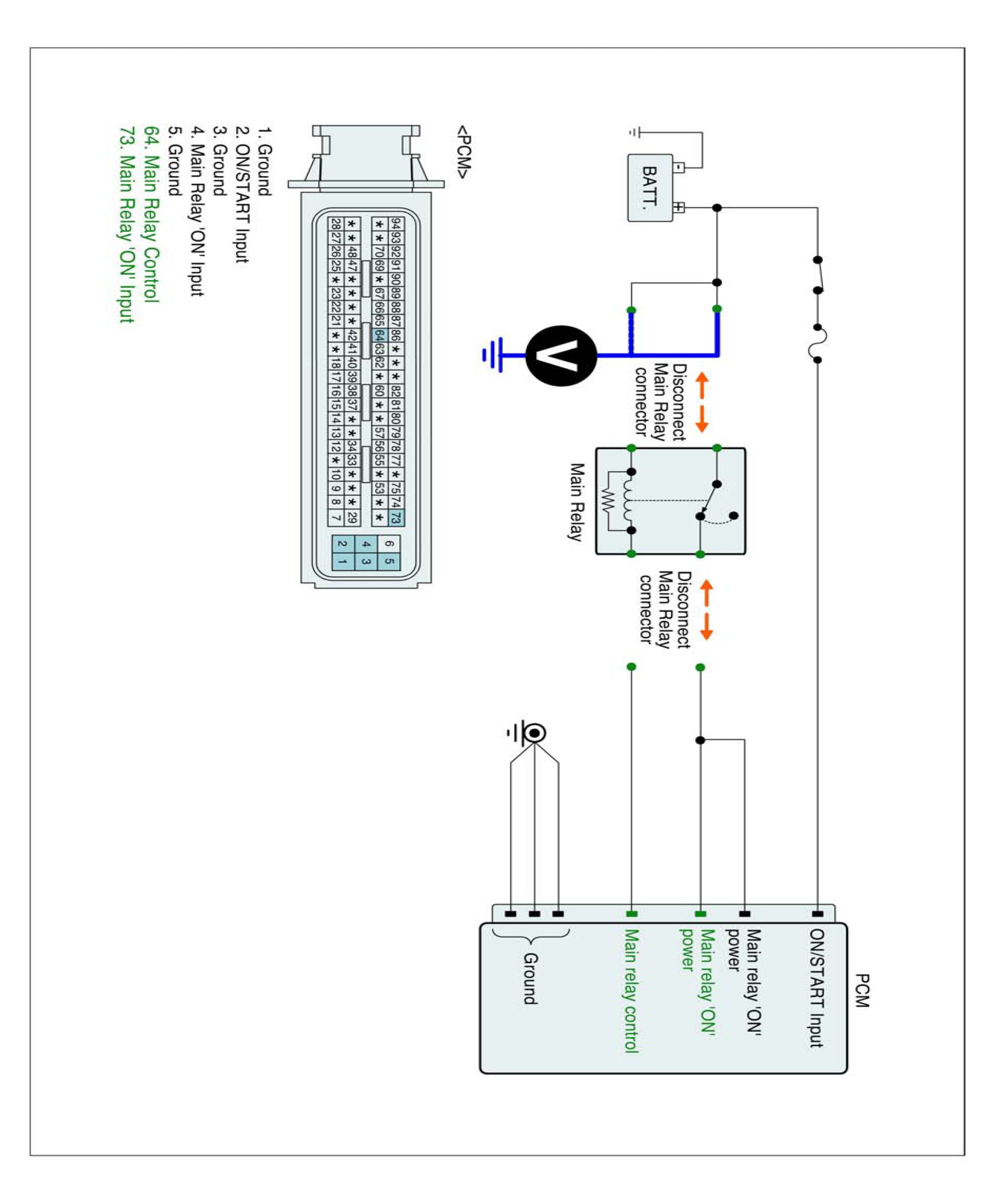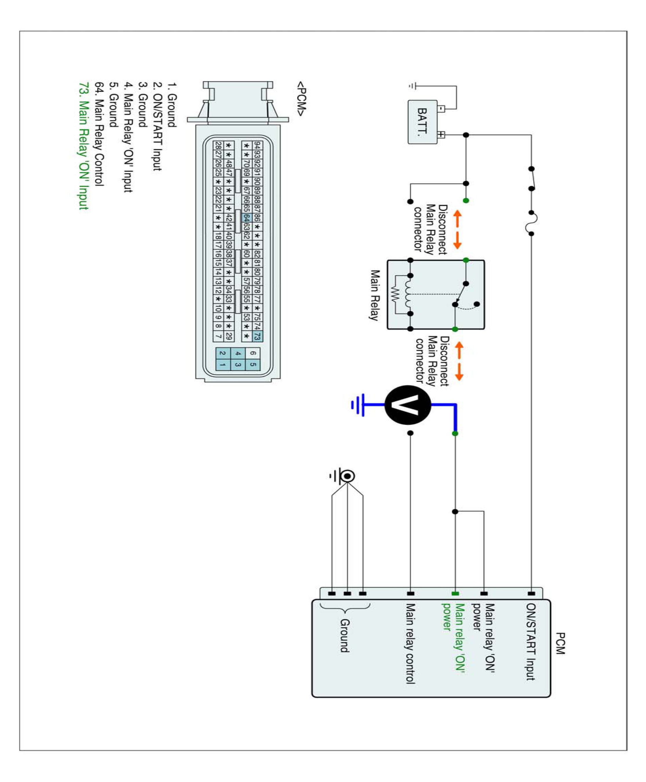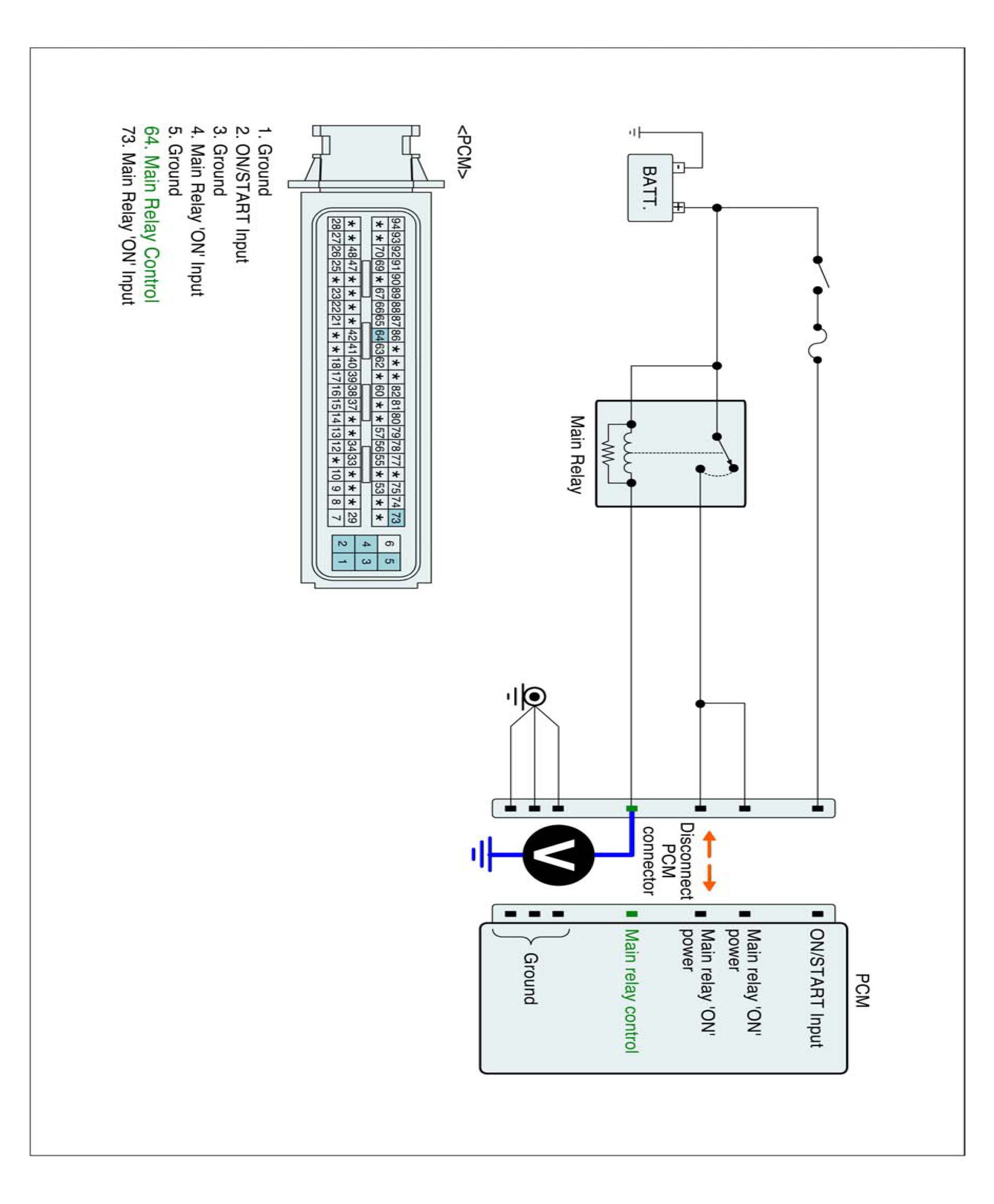 2. With ECM connector disconnected, measure voltage between main relay control terminal of the PCM harness connector and chassis ground.