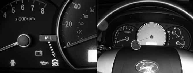 The Malfunction Indicator Lamp (MIL), which is located in the instrument cluster, comes on to notify the driver that there may be a problem with the vehicle and that service is needed. Immediately after the ignition switch turns on, the malfunction indicator lamp is lit to indicate that the MIL operates normally and goes off after starting