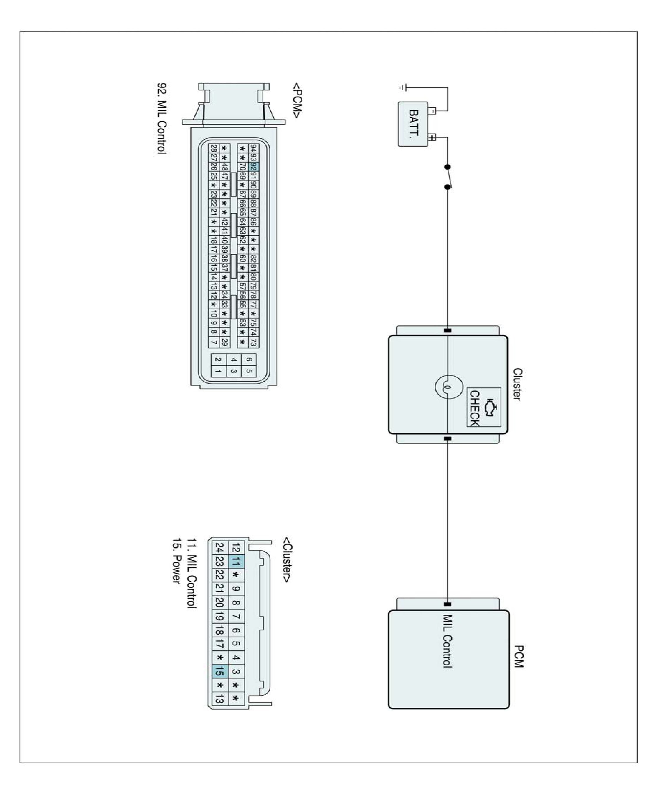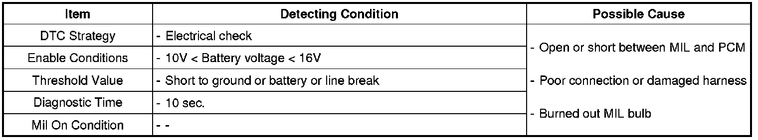 PCM sets DTC P0650 if the PCM detects that the MIL control line is open or short circuit to ground or battery line.