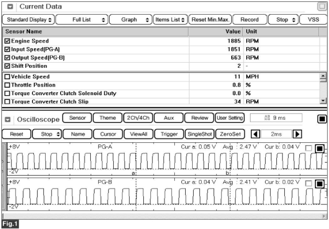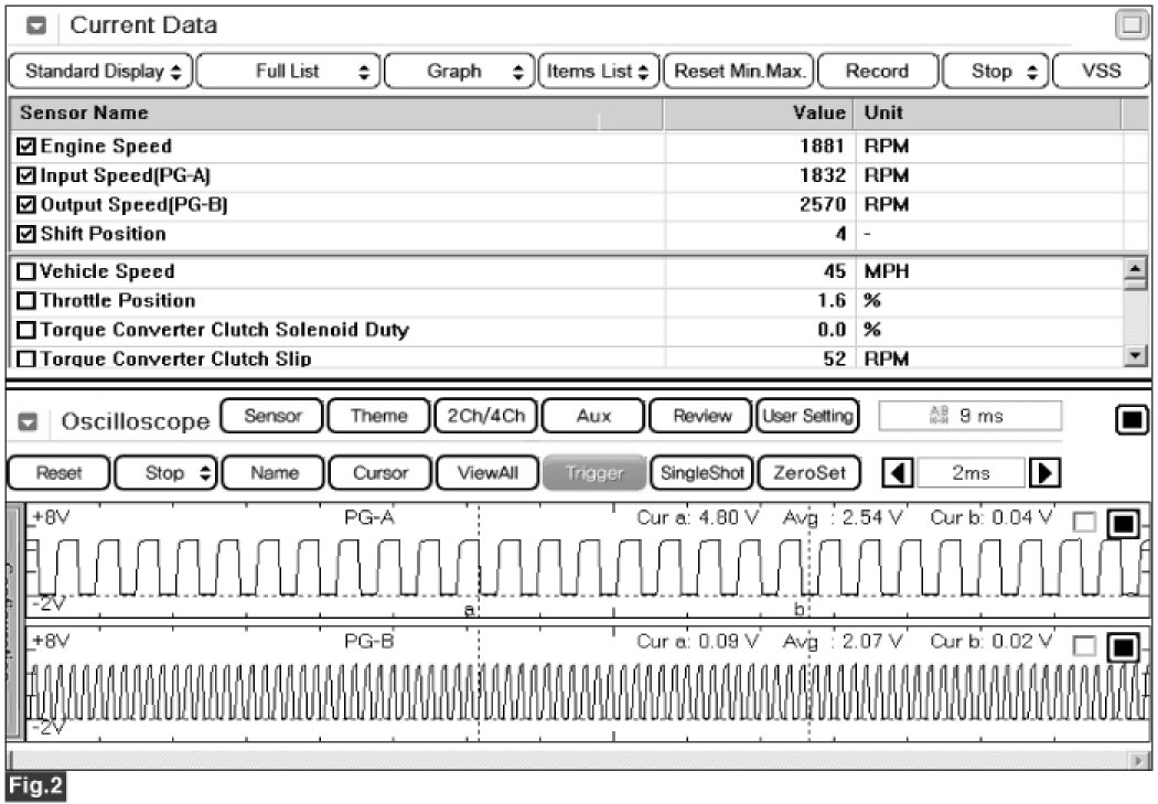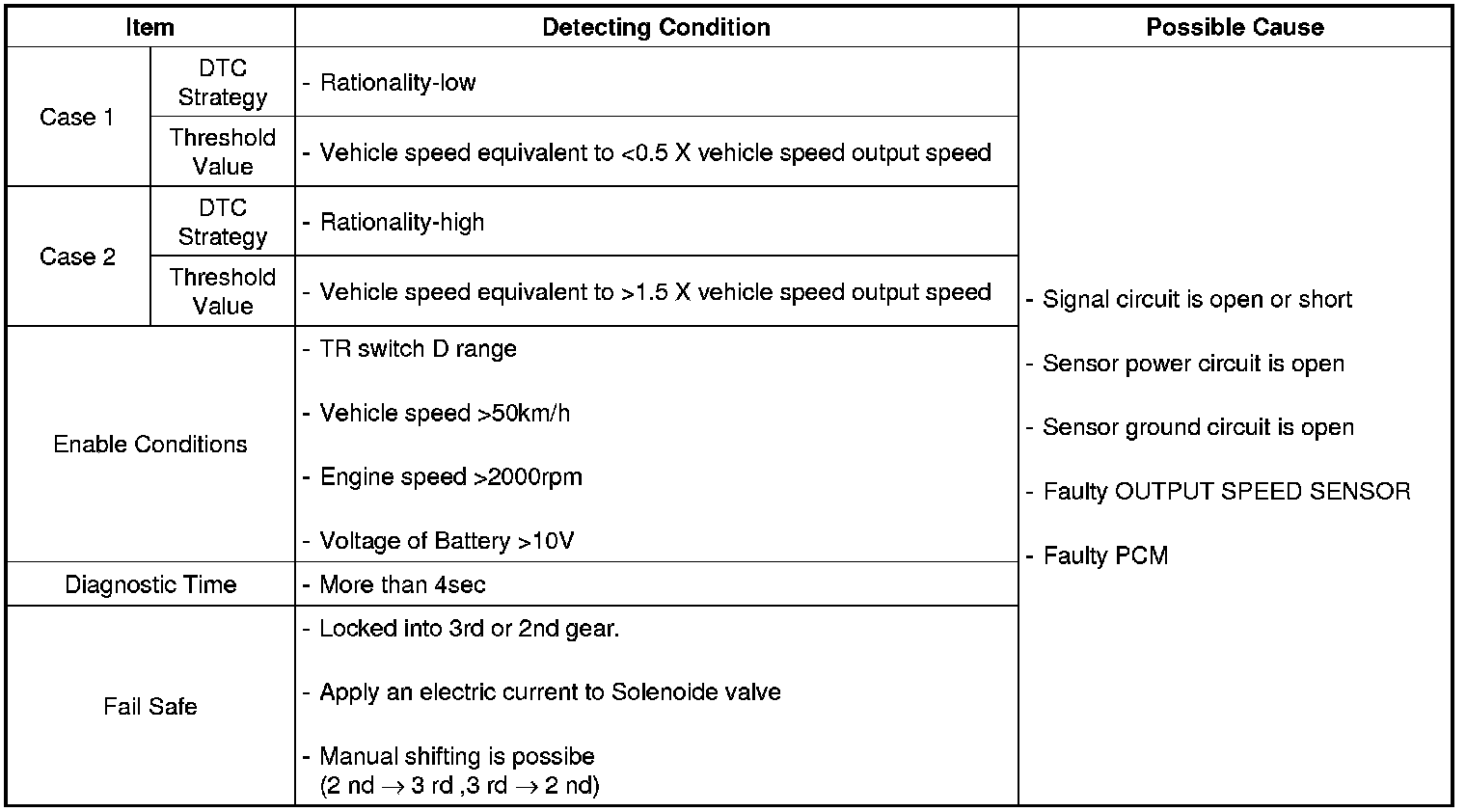 The TCM sets this code if the calculated value of the signals is noticeably different from the value calculated, using the Vehicle Speed Sensor output, when the vehicle is running faster than 18.6 MPH (30 km/h). The TCM will initiate the fail safe function if this code is detected.