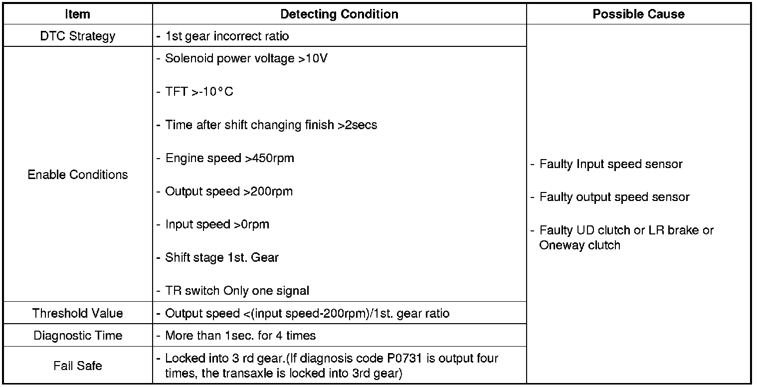 This code is set if the value of input shaft speed is not equal to the value of the output shaft, when multiplied by the 1st gear ratio, while the transaxle is engaged in 1st gear. This malfunction is mainly caused by mechanical troubles such as control valve sticking or solenoid valve malfunctioning rather than an electrical issue.