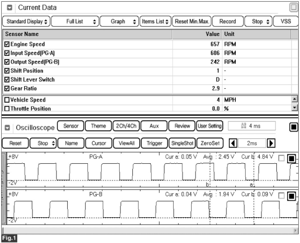The value of the input shaft speed should be equal to the value of the output shaft speed, when multiplied by the 1st gear ratio, while the transaxle is engaged in the 1st gear. For example, if the output speed is 1000 rpm and the 1st gear ratio is 2.842, then the input speed is 2842 rpm.