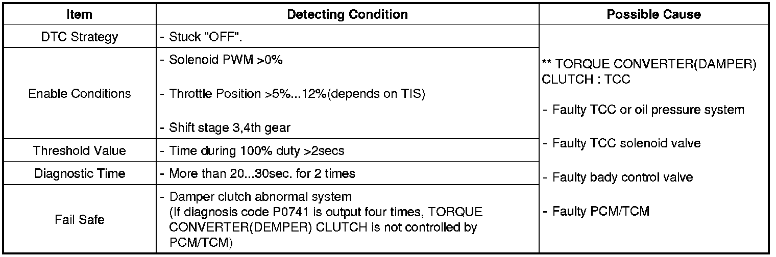 The PCM/TCM increases the duty ratio to engage the Damper Clutch by monitoring slip rpms (difference value between engine speed and turbine speed). To decrease the slip of the Damper Clutch, the PCM/TCM increases the duty ratio by applying more hydraulic pressure. When slip rpm does not drop under some value with 100% duty ratio, the PCM/TCM determines that the Torque Converter Clutch is stuck OFF and sets this code.
