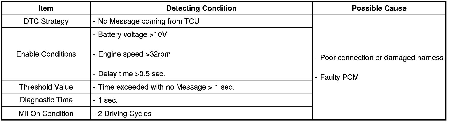 The PCM determines CAN communication error and sets DTC U0101 if no message received from TCM
