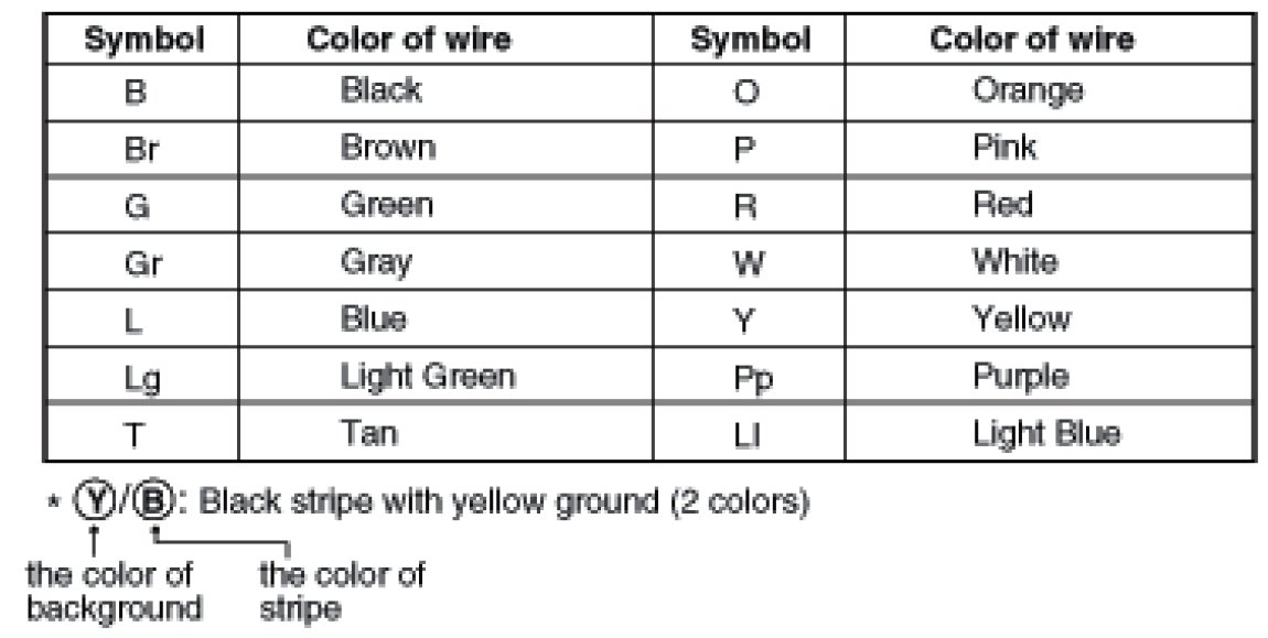The following abbreviations are used to identify wire colors in the circuit schematics.