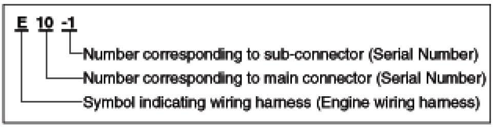 A Connector identification symbol consists of a wiring harness location classification symbol corresponding to a wiring harness location and number corresponding to the connector.