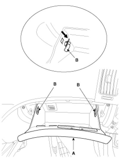 1. Disconnect the damper (B) from the glove box (A).