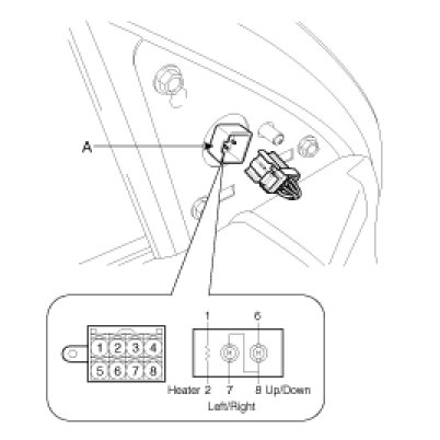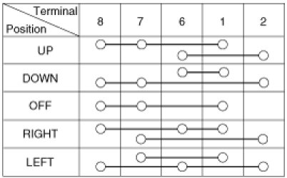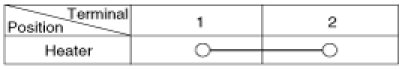 3. Apply battery voltage to each terminal as shown in the table and verify that the mirror operates properly.