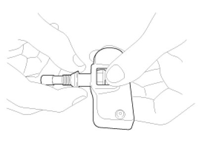 6. While maintaining the sensor contact with the rim by applying pressure to the back of the valve, slightly press on the cap towards the center of the wheel in order to adapt the angle of the valve/sensor to the profile of the rim. It is mandatory to guarantee the contact of the housing unit on the rim drop center.