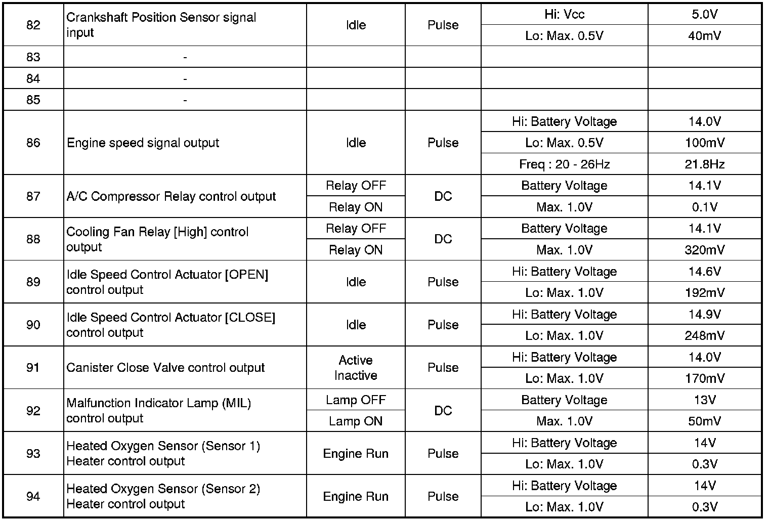 Pinout Values and Diagnostic Parameters