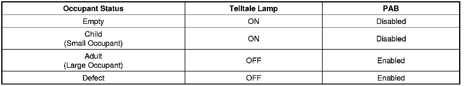 The Telltale Lamp indicates the Passenger Airbag(PAB) enabled and disabled status based on occupant status of passenger seat. If the passenger seat is empty or occupied with child (or child seat), the Passenger Airbag is disabled and the Telltale Lamp is turned ON to inform the driver that the PAB is disabled. As soon as operating voltage is applied to the SRSCM ignition input, the SRSCM activates telltale lamp turn.