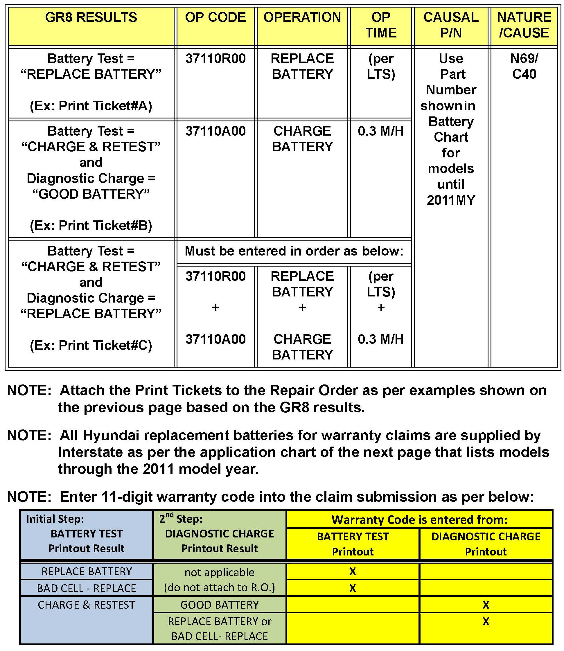 Print Tickets that must be attached to the Repair Order based on Battery Test result and Diagnostic Charge result are shown below, also listed are the warranty claim types: