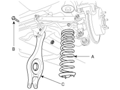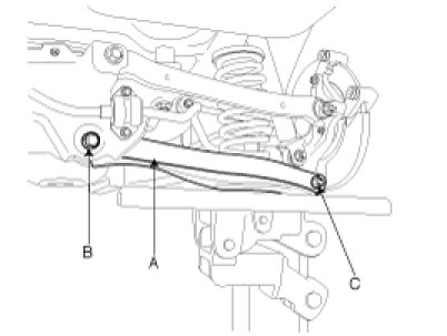 6. Remove the rear lower arm (C) from the cross member by removing the bolt (B) completely.