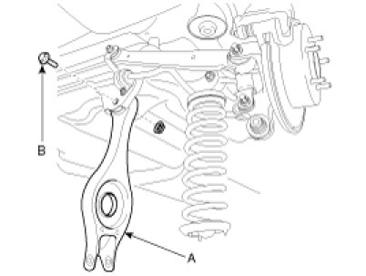 3. Adjust height of the jack to place the bolt (B) holding rear lower arm and carrier assembly through the mating holes.
