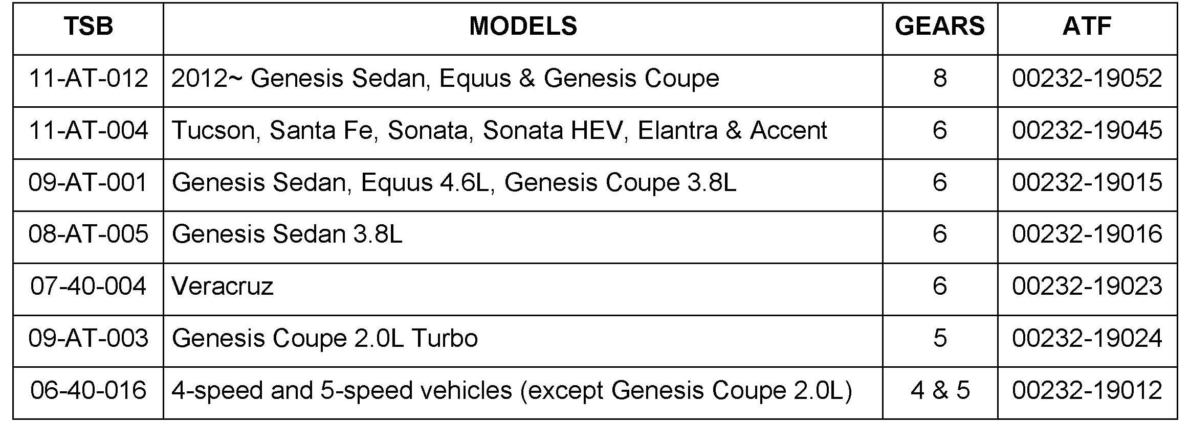9. 6-SPEED ATM: 2010 Tucson & Santa Fe, 2011 Sonata, Sonata HEV, Elantra and Azera, 2012 Accent