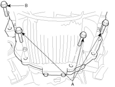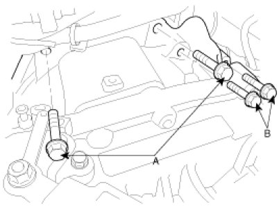 2. Install one mounting bolt (A), from the transaxle side and the other (B) from the engine side.